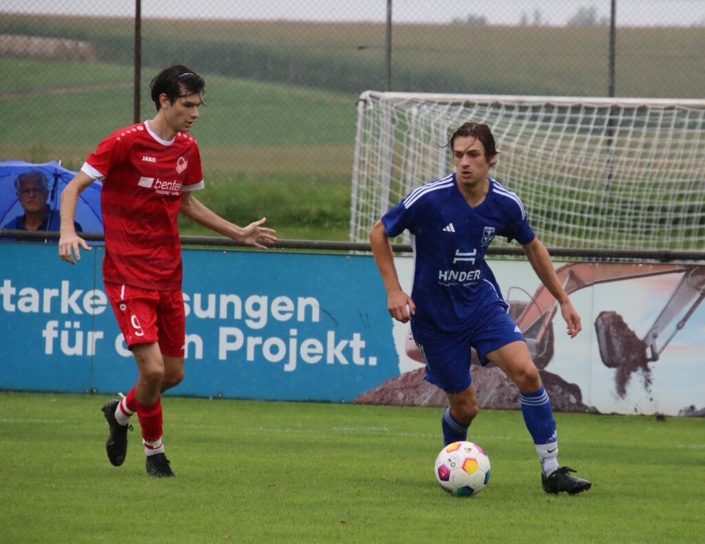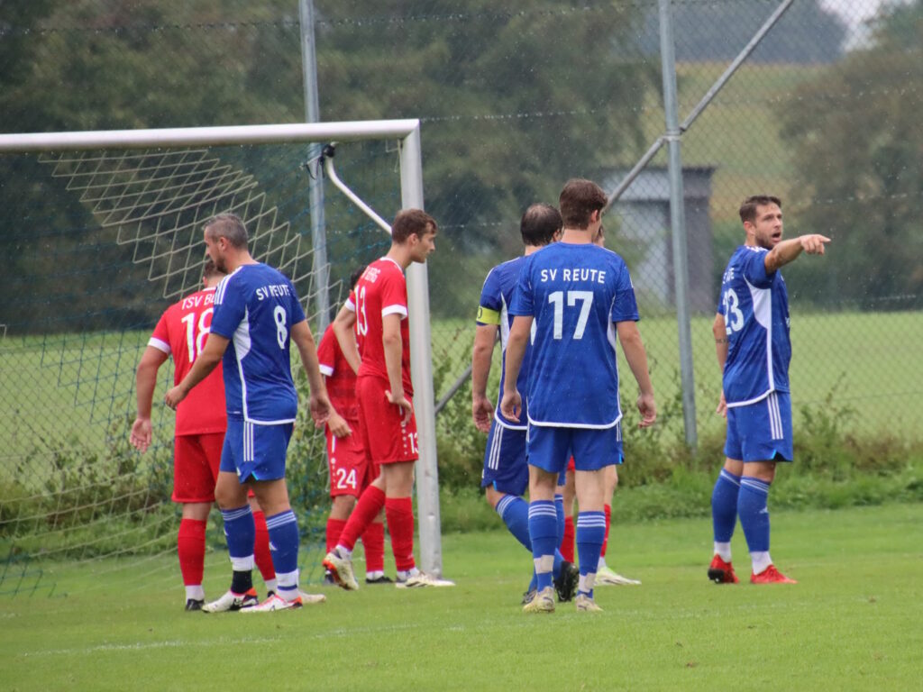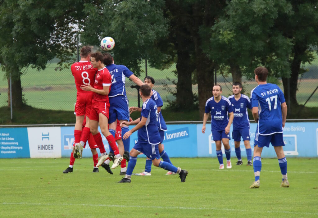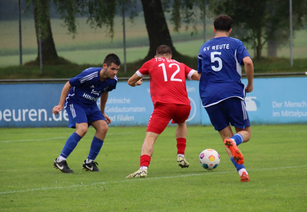 Bei Dauerregen startete der SV Reute in die dritte Heimpartie der noch jungen Saison gegen den Tabellendritten TSV Berg II. Auf nassem Untergrund entwickelte sich schnell eine flotte Partie, die Gäste agierten wie gewohnt mit frühem Pressing, das Reute aber mit gutem Gegen-Pressing konterte. Belohnen konnten sich die Hausherren in der 23.Minute mit dem Führungstreffer. Furkan Bastan drang auf rechts unwiderstehlich in den Strafraum, sein Zuspiel setzte Maximilian Heß an den linken Torpfosten. Doch Justin Matt schaltete blitzschnell und legte den Ball in den Rückraum, wo Maurice Epple satt zum umjubelten 1:0 traf. Allzulange konnten sich die Hausherren aber über diesen Vorsprung nicht freuen, schon acht Minuten später konnten die Gäste ausgleichen. David Rittner ließ mit schöner Körpertäuschung seinen Gegenspieler stehen und traf flach links unten zum 1:1. Keine vier Minuten später konnte Berg sogar in Führung gehen, als die Gäste einen missglückten Abschlag gedankenschnell zum 1:2 ausnutzten. Kurz vor dem Pausenpfiff forderten die Gastgeber vehement Strafstoß, als Maximilian Heß deutlich hörbar im Strafraum von seinem Gegenspieler getroffen wurde – die Pfeife des Unparteiischen blieb aber stumm und ertönte stattdessen wenig später zum Gang in die Halbzeitpause.