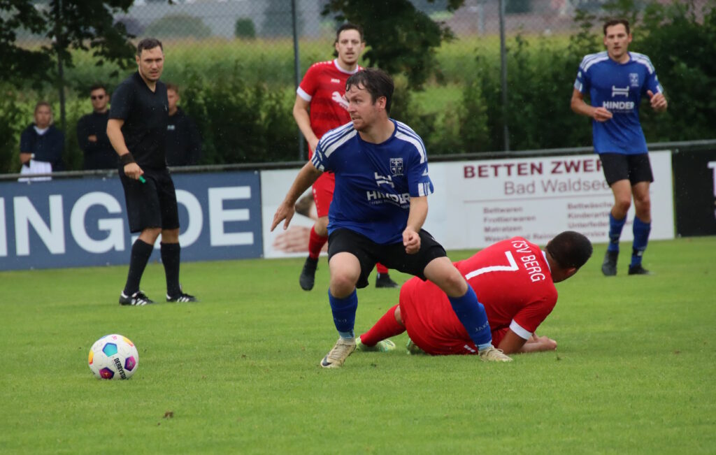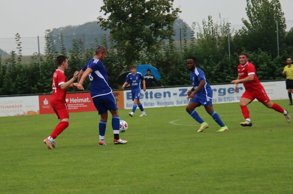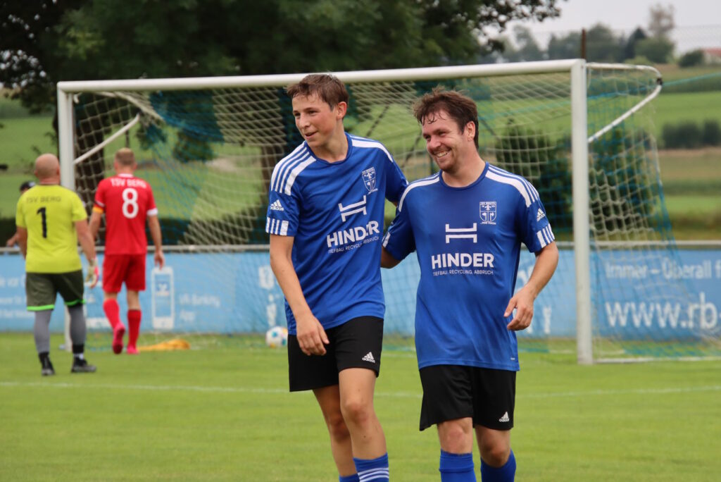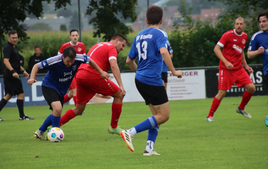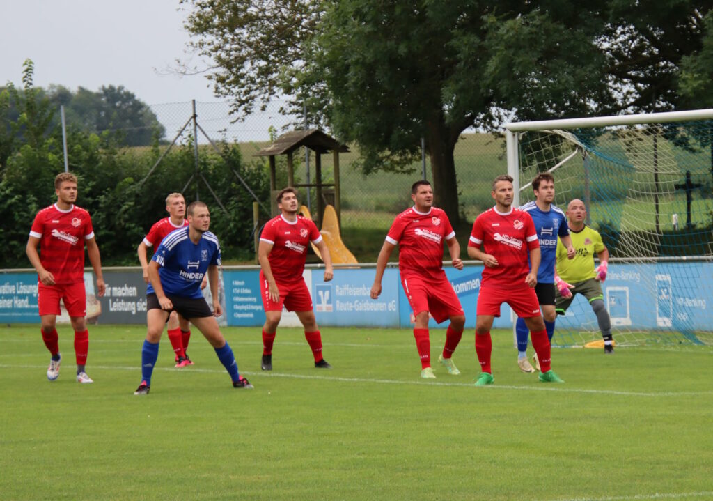 Bei Dauerregen startete der SV Reute in die dritte Heimpartie der noch jungen Saison gegen den Tabellendritten TSV Berg II. Auf nassem Untergrund entwickelte sich schnell eine flotte Partie, die Gäste agierten wie gewohnt mit frühem Pressing, das Reute aber mit gutem Gegen-Pressing konterte. Belohnen konnten sich die Hausherren in der 23.Minute mit dem Führungstreffer. Furkan Bastan drang auf rechts unwiderstehlich in den Strafraum, sein Zuspiel setzte Maximilian Heß an den linken Torpfosten. Doch Justin Matt schaltete blitzschnell und legte den Ball in den Rückraum, wo Maurice Epple satt zum umjubelten 1:0 traf. Allzulange konnten sich die Hausherren aber über diesen Vorsprung nicht freuen, schon acht Minuten später konnten die Gäste ausgleichen. David Rittner ließ mit schöner Körpertäuschung seinen Gegenspieler stehen und traf flach links unten zum 1:1. Keine vier Minuten später konnte Berg sogar in Führung gehen, als die Gäste einen missglückten Abschlag gedankenschnell zum 1:2 ausnutzten. Kurz vor dem Pausenpfiff forderten die Gastgeber vehement Strafstoß, als Maximilian Heß deutlich hörbar im Strafraum von seinem Gegenspieler getroffen wurde – die Pfeife des Unparteiischen blieb aber stumm und ertönte stattdessen wenig später zum Gang in die Halbzeitpause.