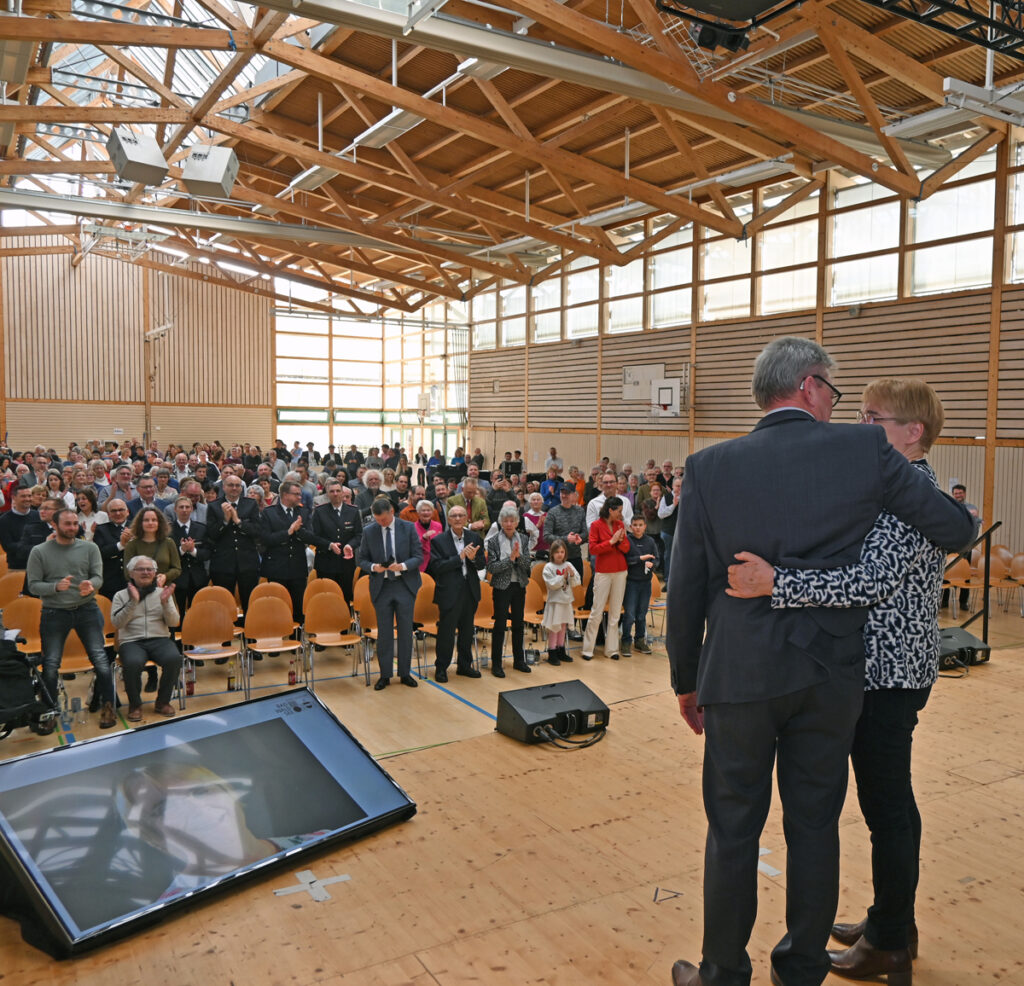 Last but not least rief der OB Rosa Eisele auf die Bühne. Der ehemaligen Ortsvorsteherin von Haiserkirch flogen auch in dieser Halle die Herzen der Besucher zu. 30 Jahre im Ortschaftsrat, davon 20 als Ortsvorsteherin, 18 Jahre im Gemeinderat. Für ihre Werte, ihr Wissen und ihre Verlässlichkeit schenkten die Menschen aus dem Haistergau ihr Vertrauen und schickten sie gerne als Botschafterin und Vertreterin ihrer Interessen in den Gemeinderat nach Bad Waldsee. Eiseles Credo nach den Worten des OB: „Wenn alle zusammenhelfen, kann etwas Tolles entstehen und gleichzeitig wächst auch die Gemeinschaft zusammen.“ Beim Beifall für Rosa Eisele hielt es keinen im Saale mehr auf den Sitzen. 600 Paar Hände spendeten der sympathischen Frau enthusiastischen Beifall.