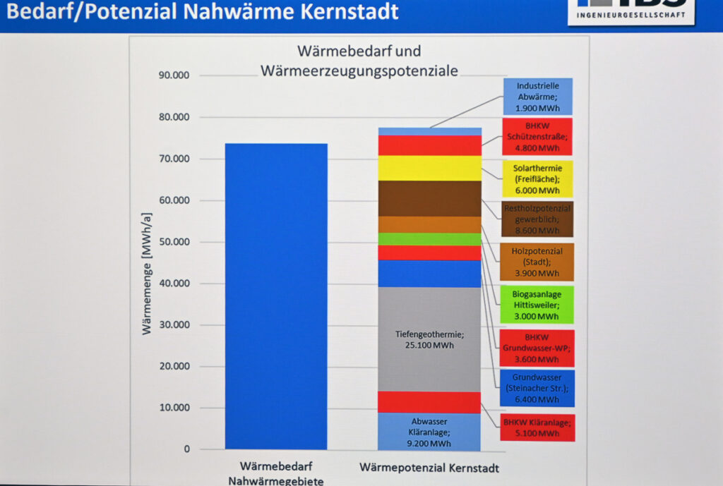Der Wärmebedarf für die Nahwärme in der Kernstadt wurde mit etwas über 70.000 MWH/a errechnet, die nach der IBS-Analyse von regionalen, erneuerbaren Energieträgern gedeckt werden könnten. Allerdings wären dafür noch beträchtliche Investitionen zum Beispiel in Tiefengeothermie notwendig. Schnell lässt sich das nicht verwirklichen.