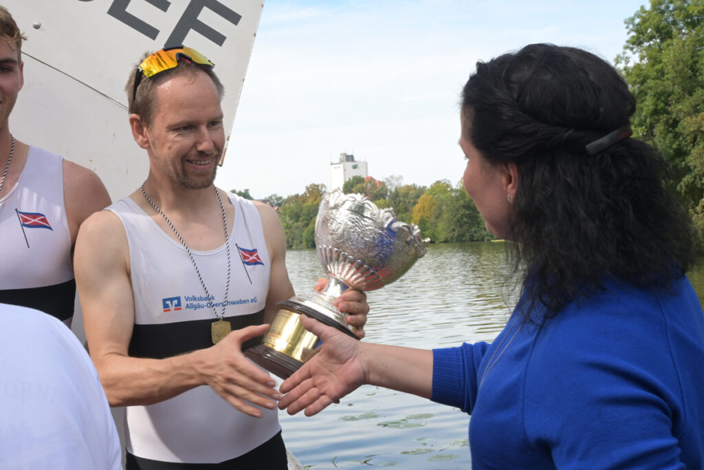 Ingrid Wölflingseder überreicht als Vertreterin des Oberbürgermeisters den Preis der Stadt Bad Waldsee an den Schlagmann des siegreichen Achters.