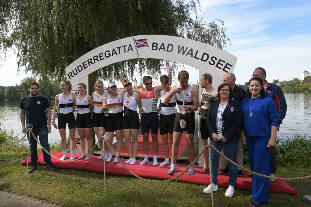 Mit Spannung erwartet wurde das Rennen um den Preis der Stadt Bad Waldsee. Klar, dieser Preis ist der höchsten Bootsklasse vorbehalten, dem Achter. Zwei Boote am Start: eines vom Ruderverein „Neptun“ aus Konstanz und eine Renngemeinschaft mit Mitgliedern aus Bad Waldsee, Heidelberg, Tübingen, Kaufering und Waiblingen. Vom Start weg lieferten sich die Boote einen ausgeglichenen, harten Zweikampf, Boot an Boot, Riemen an Riemen zogen sie nebeneinander über die 500 Meter lange Sprintstrecke. Wer hat den Bug vorne? Im Fotofinish siegte die Renngemeinschaft mit den Bad Waldseern vor dem Boot des Rudervereins „Neptun.“ Die Siegerzeit 1:31.25, der Zweitplazierte nur Zehntel zurück mit 1:31.57.