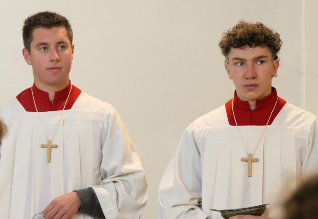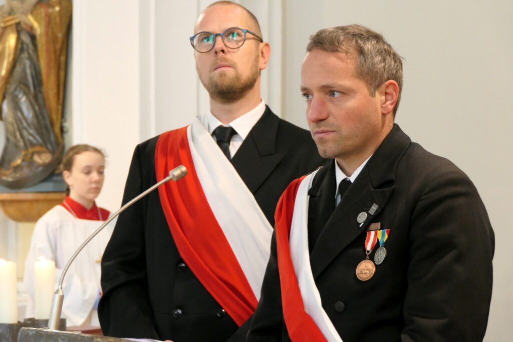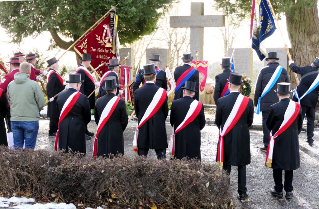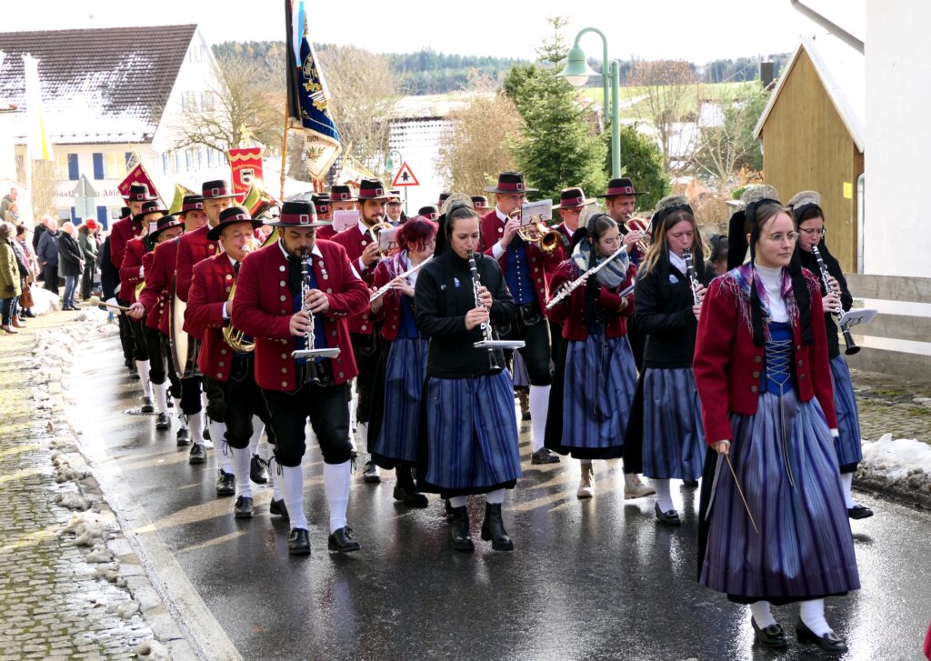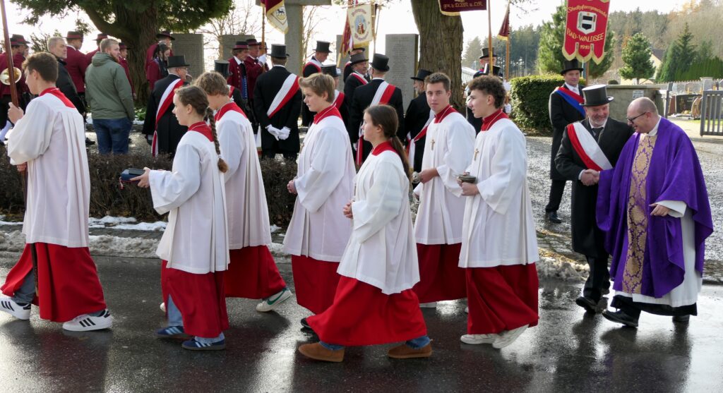 Beim Hochamt in der Kirche und bei der Versammlung am Ehrenmal der Opfer der Weltkriege waren nicht nur die Mitglieder des Blutreitervereins mit ihrem Vorsitzenden Josef Liebrich jun. dabei, sondern auch eine Fahnenabordnung der Blutreitergruppe Bad Waldsee, die Fahnenabordnung des Liederkranzes mit dem „Singmit“-Chor, der auch den Gottesdienst gesanglich bereicherte, die Fahnenabordnung und die Musikerinnen und Musiker des Musikvereins, die ebenfalls ihre musikalischen Beiträge einbrachten und den Blutreitern zu ihrem 100-jährigen Jubiläum der Blutreitergruppe gratulierten.