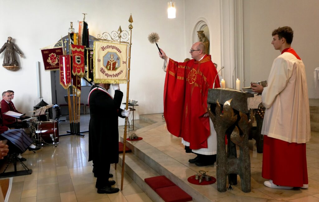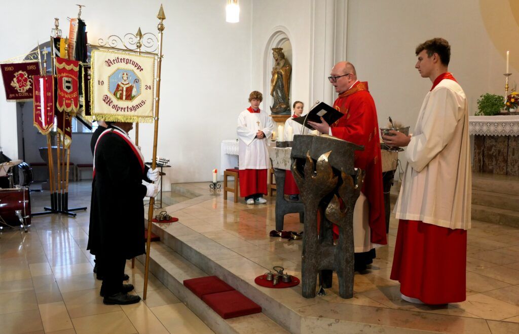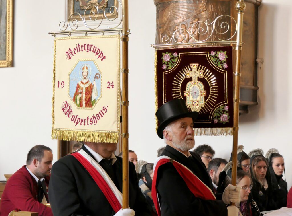 In seinen Worten bei der Standartensegnung (Bild) erinnerte der Zelebrant nach der Kommunion nochmals an die Patronin der Kirchengemeinde. So sprach er unter anderem die Bitte aus, dass sich „die Kameradinnen und Kameraden der Blutreiter in Molpertshaus in Frieden unter diesem Banner vereinen, die Generationen verbinden und der Jugend Möglichkeiten des Kontaktes und der Zuwendung bieten“. Die Standarten sollen alle, „die diesem Zeichen folgen, zu einer Gemeinschaft des Friedens, der Hilfsbereitschaft und des Gebetes zusammenschließen, Freude spenden und Mut geben“, so Pater Hubert wörtlich.