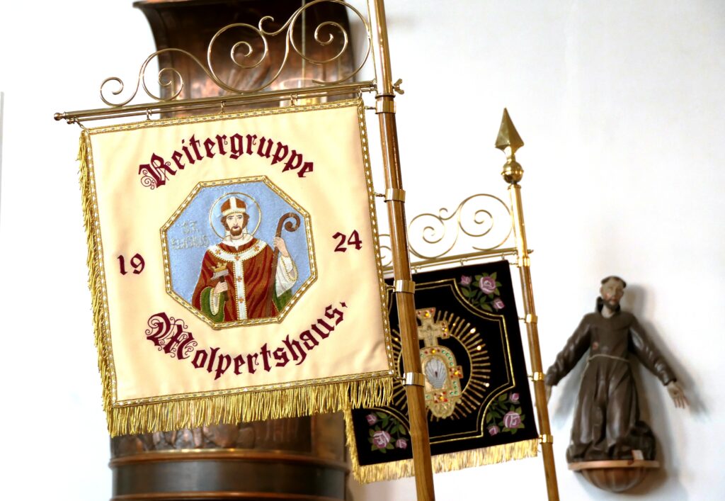 Im Hochamt anlässlich des Patroziniums konnte in der Pfarrkirche an ein erfreuliches Jubiläum mit einem würdigen Geschenk erinnert werden. Pater Hubert Vogel SDS segnete in einer feierlichen Zeremonie mit Weihrauch und Weihwasser die beiden ganz neuen Standarten der Blutreitergruppe mit gestickten Portraits der heiligen Katharina von Alexandrien und des heiligen Eligius von Noyon. Katharina wird in Molpertshaus als Kirchenpatronin verehrt, der nicht so bekannte Eligius von Noyon ist Patron der Mennisweiler Dorfkapelle und war Patron der im Jahre 1820 abgerissenen Loyenkapelle, die in Mennisweiler im Bereich der Kreuzung stand. Bis ins Jahr 1820 gab es in Mennisweiler im Gedenken an den heiligen Bischof Eligius, der einstmals Hufschmied war und einem störrischen Pferd, der Legende nach, ein Bein abnahm, um dieses zu beschlagen und danach wieder anzusetzen, einen nicht unbedeutende Prozession zu Pferde.