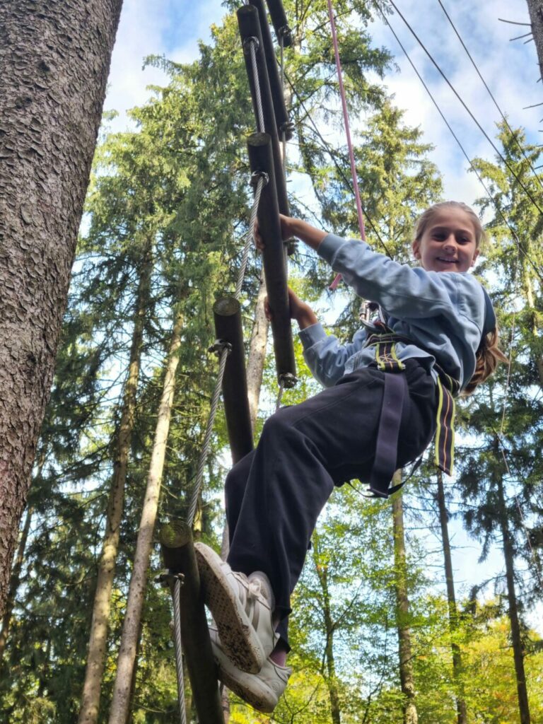 Im Tannenbühl erklimmt jeder Schüler über eine wackelige Strickleiter eine Plattform, die sich in 8 bis 10 m Höhe befindet und wird dann mit Klettergurt und Seil von vier Klassenkameraden gesichert. Natürlich immer unter den wachsamen Augen von Herrn Hörter sowie unserem Schulsozialarbeiter Herr Stöhr. Hier machen die Schüler ganz real die Erfahrung, dass sie von den Mitschülern gehalten werden und sich auf die anderen verlassen können. Und die, die sichern, erleben, dass sie wichtig sind, dass es auf jeden Einzelnen ankommt und sie Verantwortung tragen, dass dem anderen nichts passiert.