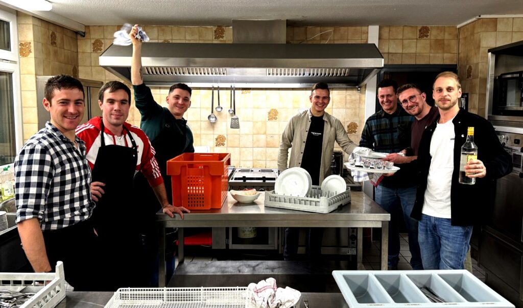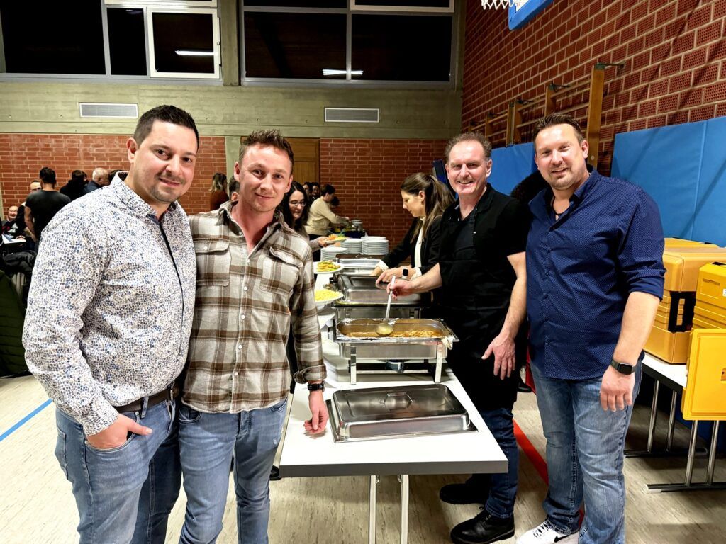 Mit Fug und Recht kann behauptet werden, dass dieses Organisationsteam alles im Griff hatte und auch viele Helferinnen und Helfer zur Mitarbeit zu animieren verstand. Letztendlich musste ein Serviceteam für das reichhaltige Essensangebot mit schwäbischen Köstlichkeiten, für die Getränkeausgabe, die Bestuhlung und auch für Dienste in der Küche gefunden werden. So hatte beispielsweise der Mannschaftsrat (Spielerrat) die Geschirrreinigung übernommen.