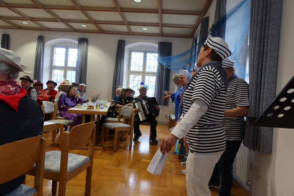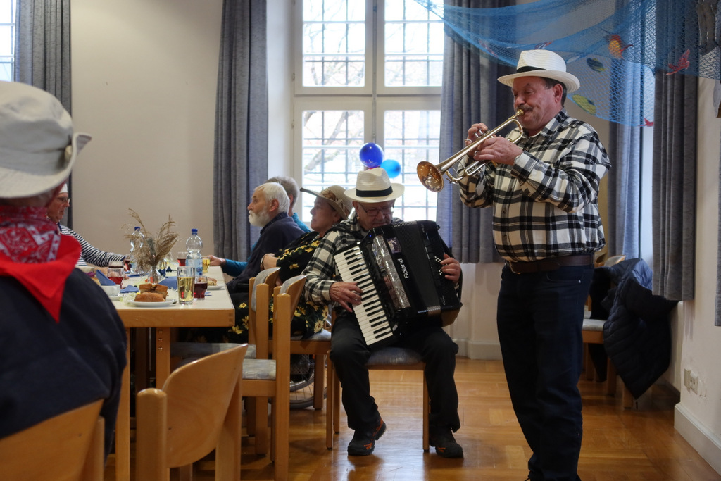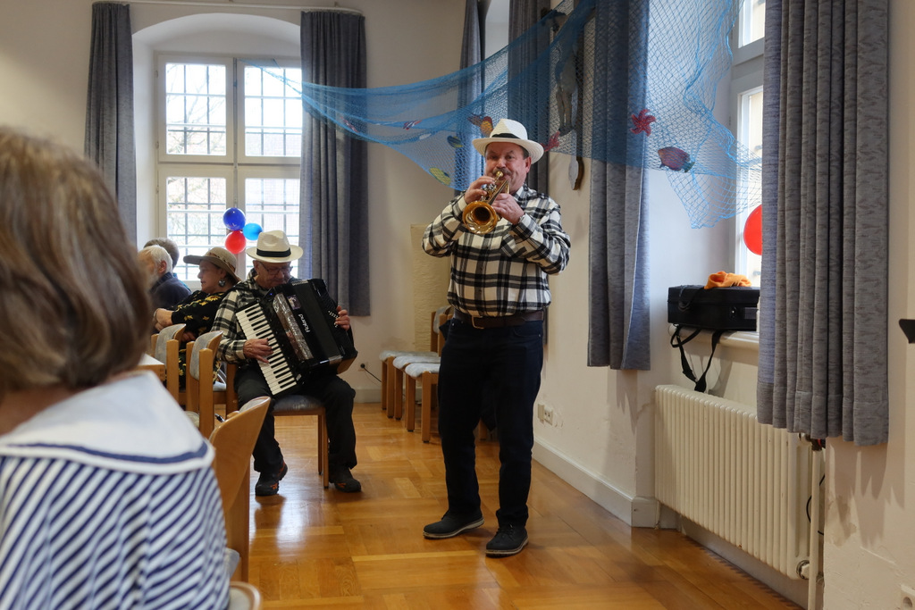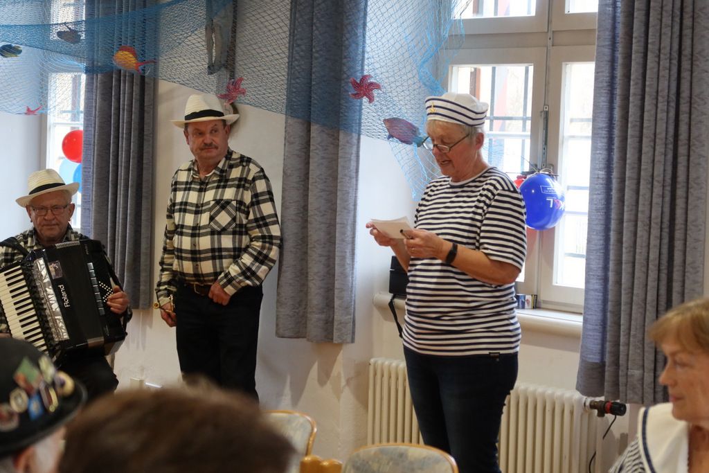 Die Vorsitzende Marianne Ploil begrüßte die Anwesenden, und gleich gesellten sich die Matrosen dazu, die ein selbstgedichtetes Eröffnungslied vortrugen. Unterstützt wurden sie musikalisch durch das bereits bestens bekannte Duo mit dem Wassermer Konny am Akkordeon und dem Meistertrompeter Franz Gapp aus Bad Waldsee. Die Beiden sorgten für beste Stimmung, nicht nur durch ihre hinreißende Musik, sondern auch durch ihre bravourösen Witze und Anekdoten, so dass alle Gäste zum Schmunzeln und Lachen gebracht wurden.