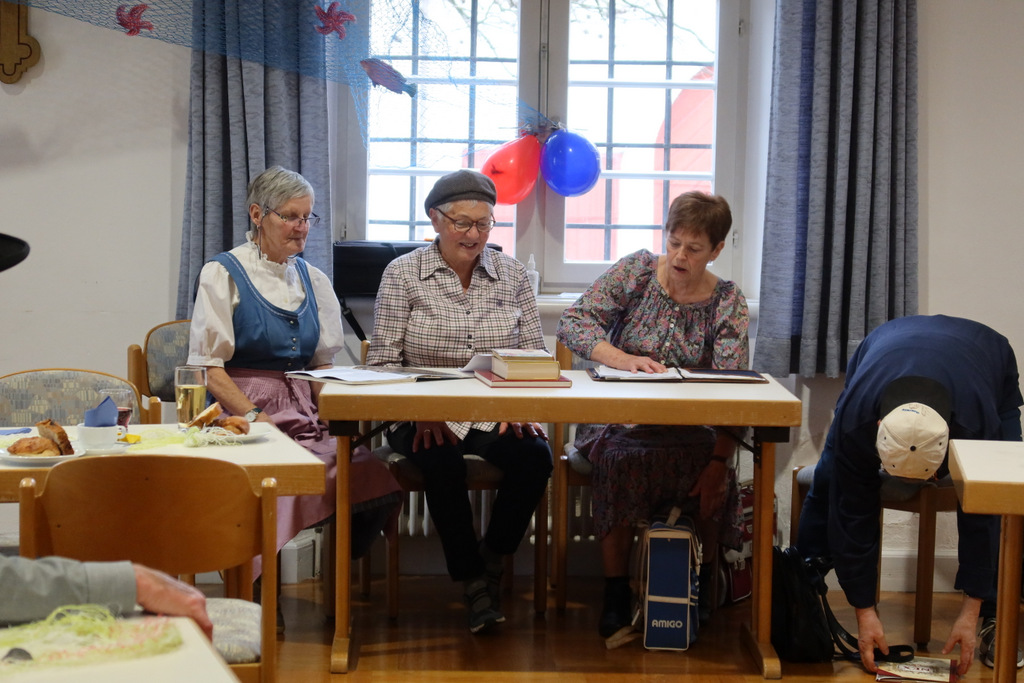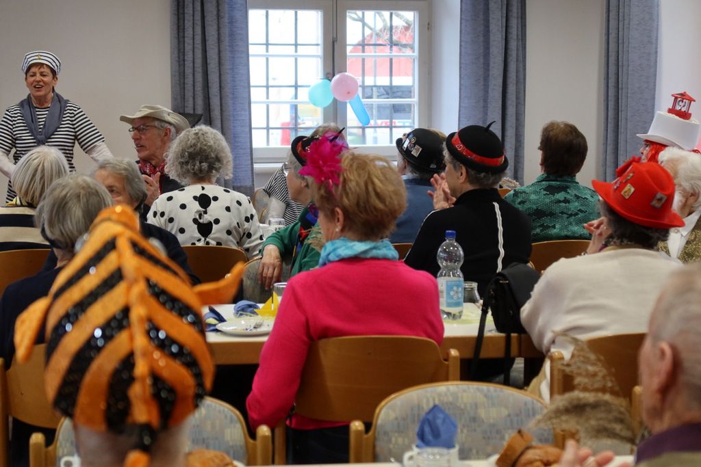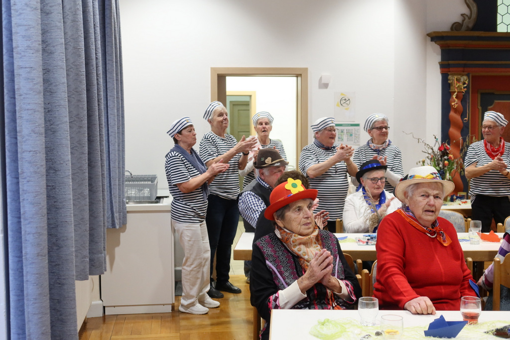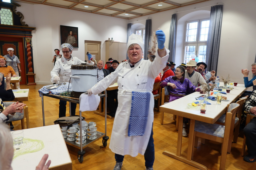 Nach Fasnetsküchle und Marmorkuchen mit Kaffee folgten die Programmeinlagen des Service- Teams mit Roswitha Bühler, Gertrud Härle-Ruther, Camilla Maucher, Marianne Ploil, Irmgard Ott und Christa Schmid. In einer Religionsstunde brachten Mädchen und ein Bub köstliche Wortklaubereien zu Gehör. Dabei wurden auch viele Bibeltexte sinnentstellt wiedergegeben, so dass die Lehrerin, Marianne Ploil, schließlich an ihren pädagogischen Fähigkeiten zweifelte. Langanhaltender, kräftiger Applaus war der Dank für diese Darbietung.