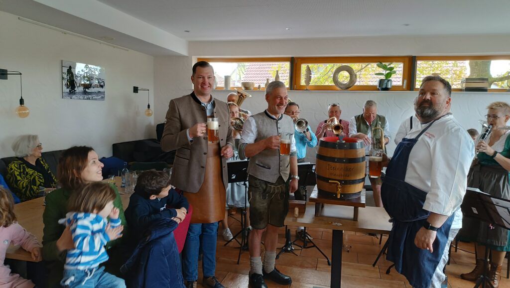 Pünktlich um 11.00 Uhr konnte mit großem Beifall Oberbürgermeister Matthias Henne mit seiner ganzen Familie willkommen geheißen werden. Er durfte auch gleich zur Tat schreiten und gekonnt erledigte er mit nur zwei Schlägen den Fassanstich des 30-Liter-Fasses der Steinacher Hausbrauerei. So erklang das erste „Ein Prosit der Gemütlichkeit“ gemeinsam mit dem OB, Braumeister Armin Sauter und Gastwirt Oli Elser. Matthias Henne war voll des Lobes für diese Steinacher Gemeinschaftsaktion zu Gunsten der Suppenküche Bad Waldsee.