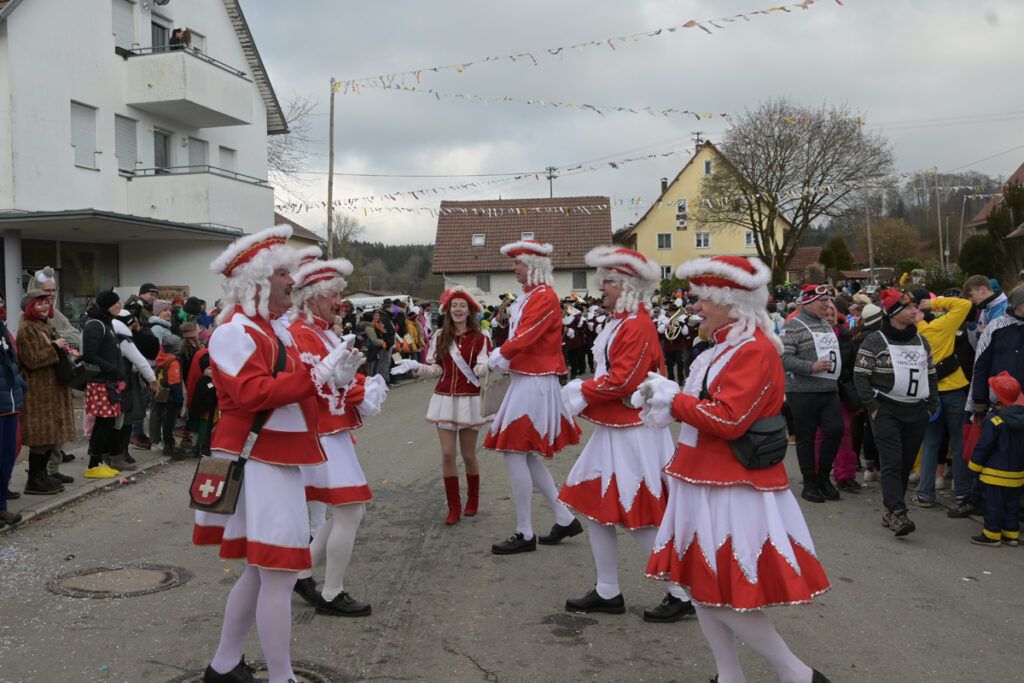 Gleich am Kopf des Umzuges eine Fasnetsüberraschung. Nach Fahne und der Narrensamengarde kamen sechs ganz besonders hübsche Garde-„Mädels“: Sechs Zunfträte von Waldsee hatten sich in Gardekostüme von Farbe und Schnitt wie der Narrensamen, nur ein paar Nummern größer, gekleidet und paradierten gravitätisch mit. So konnte man endlich mal die schönen Beine des Fasnetsbüttels und seines Tambours sehen, die normalerweise in schweren Stiefeln stecken. Und die Federbaretts auf den Köpfen – sehr kleidsam. Da hatten sie die Lacher gleich auf ihrer Seite.