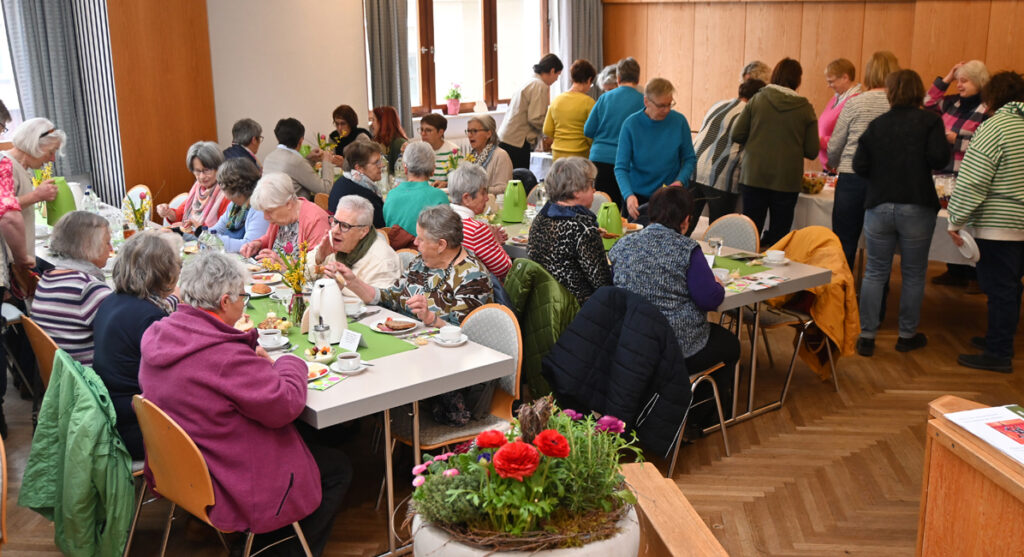 Das summselte und brummselte von fröhlicher Unterhaltung, als die Damen ihre Plätze einnahmen, ihre Teller am Büffet mit Wurst und Käse, Brot und Brötchen, Zopf und selbstgemachter Marmelade, Müsli und vielen weiteren Leckerbissen beluden. Das Büffet hatten die Landfrauen Gaisbeuren unter tatkräftiger Führung von Ingrid Maucher aufgebaut.