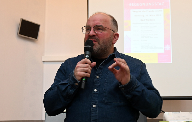 Nach einer Stunde Frühstück, Sich-Unterhalten, Bekannte von hier und da Begrüßen begann Thomas Knöller (Bild) mit seinem Vortrag zum Thema „Vergiss die Freude nicht“. Einige der Anwesenden kannten ihn noch von seiner Arbeit am Kloster Reute im Zentrum Tabor. Nach ein paar einleitenden Worten über sich und seine persönlichen Erfahrungen stellte er den Frauen die Frage „Was machen denn die Männer eigentlich heute zu Hause?“ Und gab auch gleich die Antwort mit einem lustigen Goldbären-Werbevideo, in dem sich zwei Männer in ländlicher Kulisse mit piepsigen Kinderstimmen über die Goldbären unterhielten.