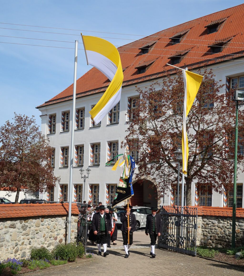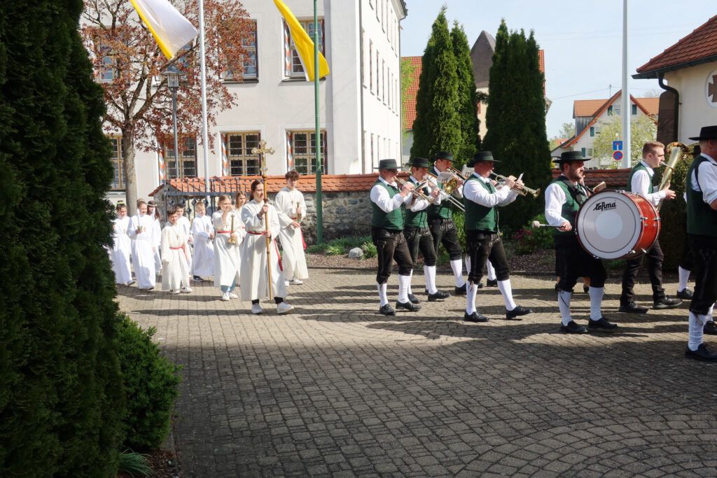 Bei frühsommerlichen Temperaturen und strahlendem Sonnenschein wurden die Kinder von Ministrantinnen und Ministranten und Pfarrer Stefan Werner im Klosterhof abgeholt und dann zu den Klängen der Musikkapelle Haisterkirch zum Gotteshaus geleitet.