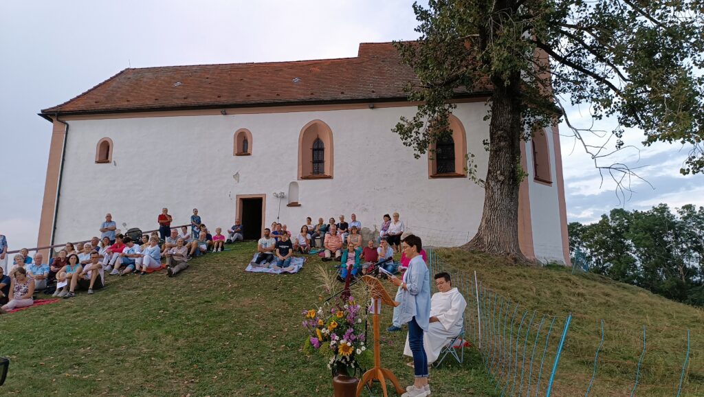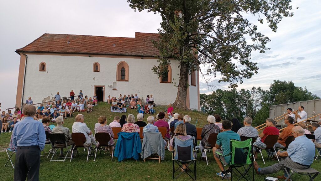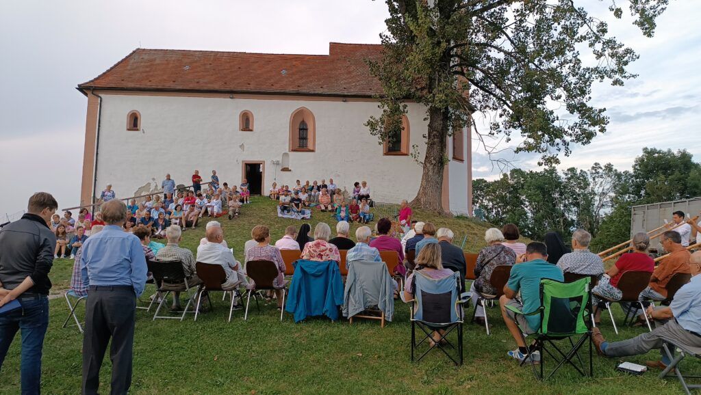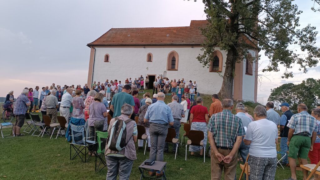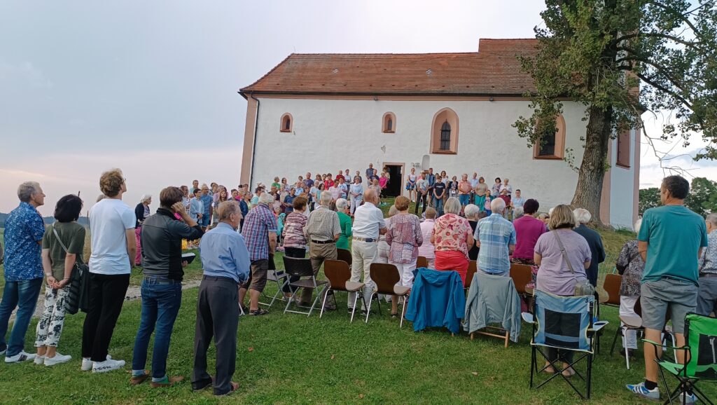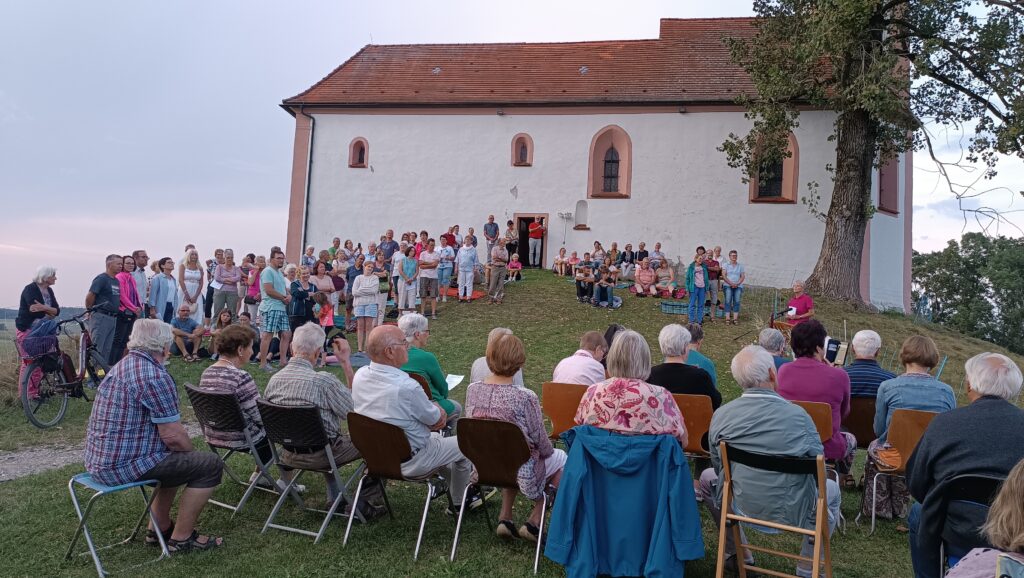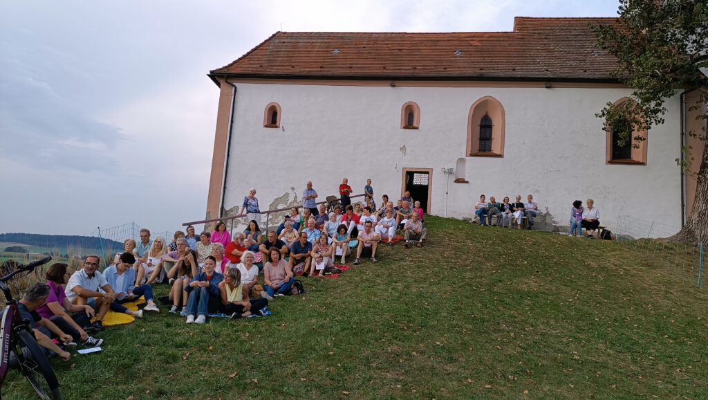 Volkertshaus – Einen herrlichen Sommertag mit einem Besuch der Volkertshauser Kapelle ausklingen zu lassen und dabei Gott für die Schönheiten der Natur zu loben, haben auch in diesem Jahr viele Personen der gesamten Seelsorgeeinheit wahr gemacht. „Lassen wir unseren Blick schweifen, hier sind wir dem Himmel ein schönes Stück näher“, so eine begeisterte Gemeindereferentin Sandra Weber bei der Begrüßung. Gerne ließen sich vor allem viele junge Familien auf Teppichen im Gras nieder. Ankommende Gewitter verzogen sich rechtzeitig auf Nachbargebiete.