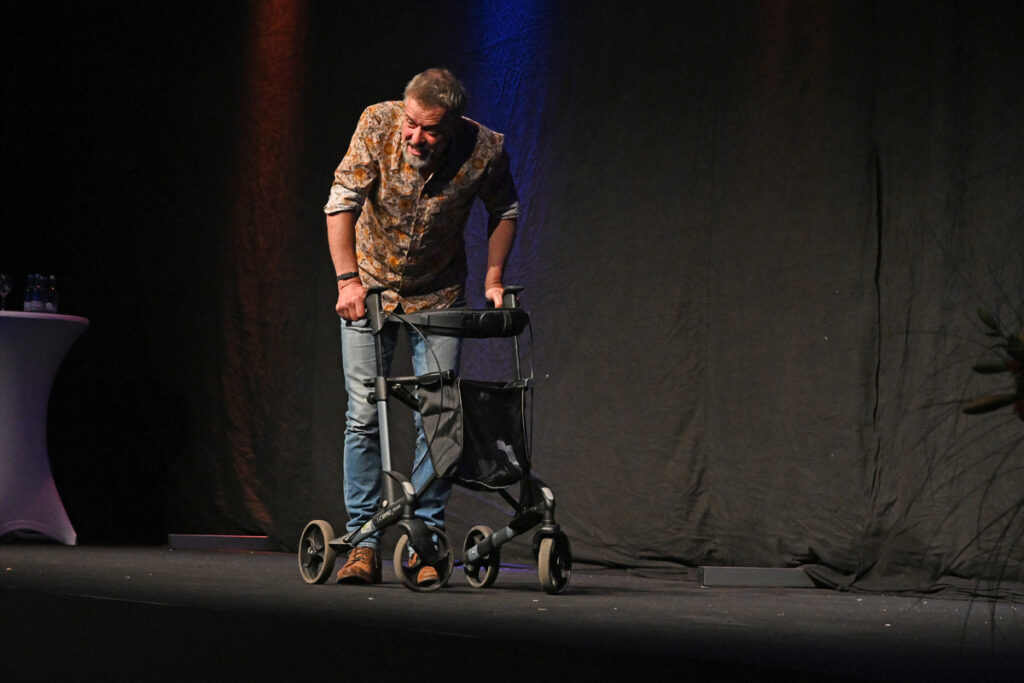 Uli Boettcher mit Rollator: Eine Kernszene seines neuen Programms „Auszeit“.