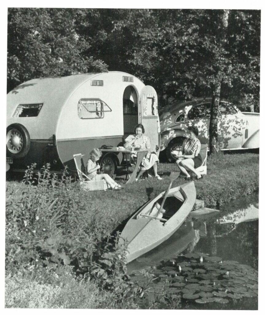 Campingidyll am Fluss: Die Familie von Hans Berger, dem Gründer von Sportberger, genießt den Urlaub. Der Wohnwagen Karawane wird von Bergers Adler 2,5 Liter gezogen. Das Sportberger Faltboot ist auch dabei. Ca. 1939 Bildrechte: Fritz Berger GmbH