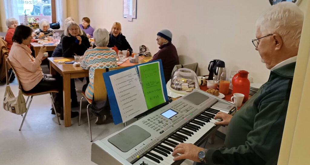 Trotz einigen Absagen wegen Krankheit freuten sich etwa 50 Personen auf diesen besonderen Tag. Viele zeigten sich überrascht, dass es für dieses Mittagessen nichts zu bezahlen gab. Wer aber trotzdem einen Obolus entrichten wollte, für den hatte Klaus Kapitel eine Spendenbox parat. Ab 11.00 Uhr hatte die Küche mit Uschi Hirsch, Inge Bendel, Wolfgang Pfefferle und Peter Niedergesäß alle Hände voll zu tun, um die Speisen zu den weihnachtlich dekorierten Tischen zu bringen. Auch Mineralwasser und Kaffee waren willkommen. Nach reger Unterhaltung der Gäste spielte Udo Meier-Böhme auf seinem Keyboard weihnachtliches Liedgut