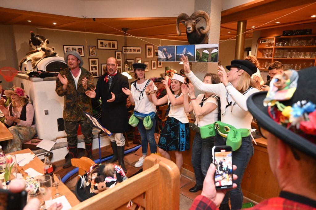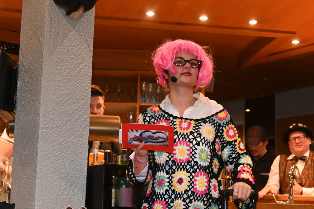 Anschließend traten die Anwärter im ersten Probejahr auf die Bretter, die die Welt bedeuten: Markus Nold, Susanne Hoffmann, Liane Becker, Mario Albersmeier, Stefan Kopf, Nikolai Kibler und Andreas Fussenegger brachten ein Herzblatt-Programm erster Güte ins „Kreuz“. Markus Nold brillierte als Rudi Carell mit Original holländischem Zungenschlag, die süße Susi als Assistentin sorgte für die Zusammenfassung, Liane Becker fürs Makeup, aber Höhepunkt waren die vier Kerle als Drag-Queens. Einfach umwerfend der Charme und die Grazie, wenn das Brusthaar aus den Dekolletees quillt. Wen wird sich König Berthe, der mit verbundenen Augen auf einem Stuhl saß, von den vier Grazien als sein Herzblatt aussuchen? Komödie vom Besten und eine echte Fasnetsgaudi.