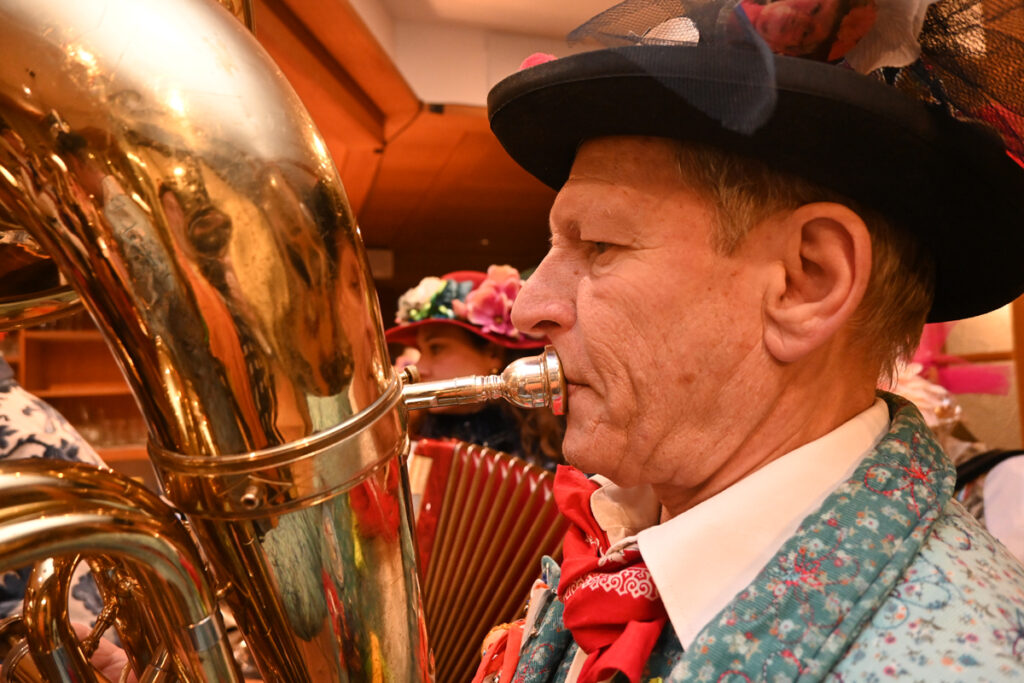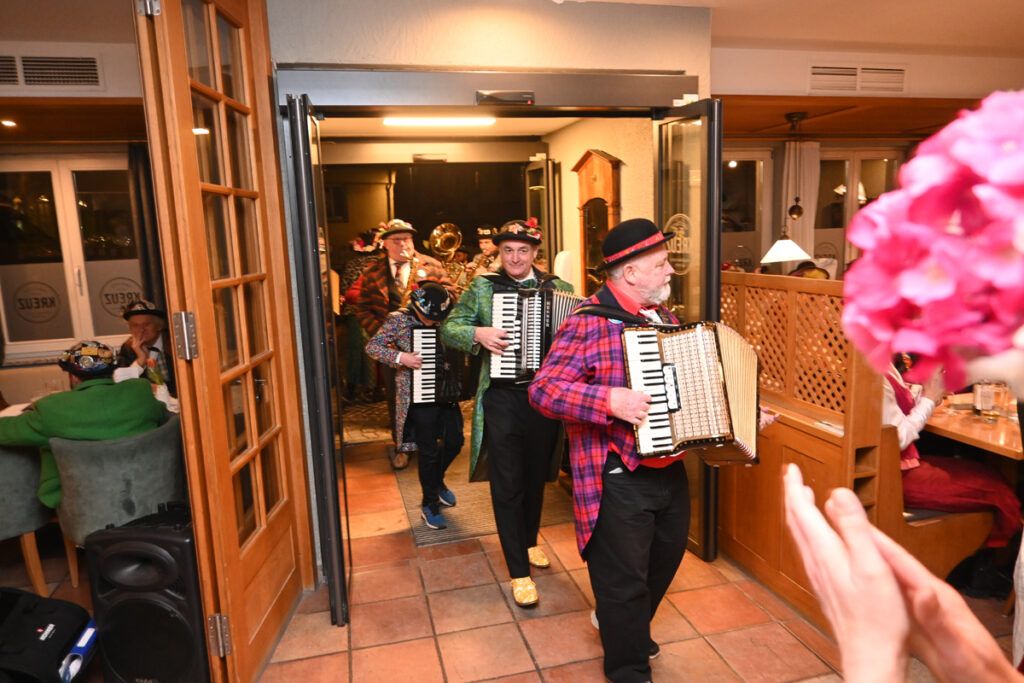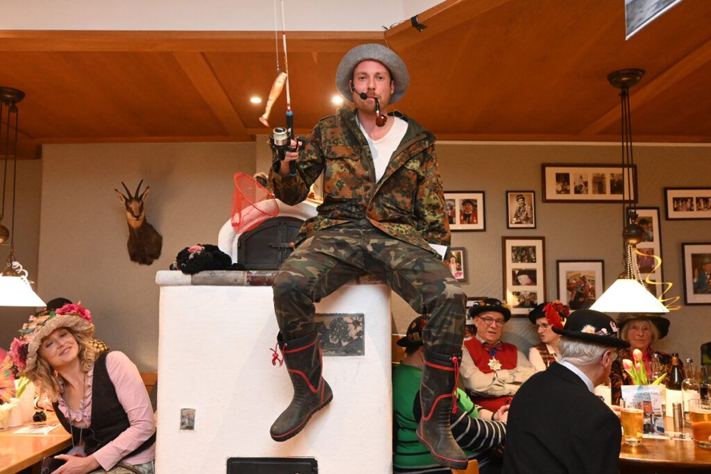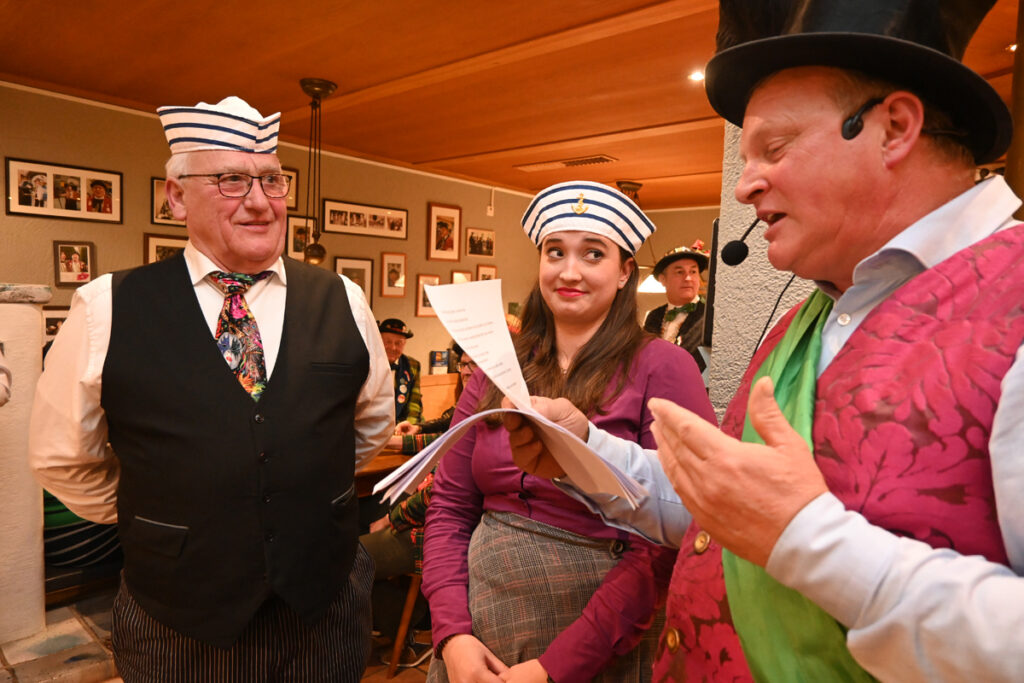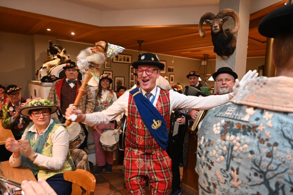 Anschließend stimmt König Berthe sein Völkle auf die kurze Fasnet ein. Zunftmeister und sein Vize sind entschuldigt, denn sie sind beim 100-Jährigen der VSAN unabkömmlich. Dafür kann er den Ehrenzuftmeister und Ehrensammler Gerold Klöckler, die Ehrensammlerin Ingrid Kraus und den Ehrensammler Herbert Denzel im „Kreuz“ begrüßen. „Hon i jetzt no jemand vergassa?“ Alles klar, alle begrüßt.