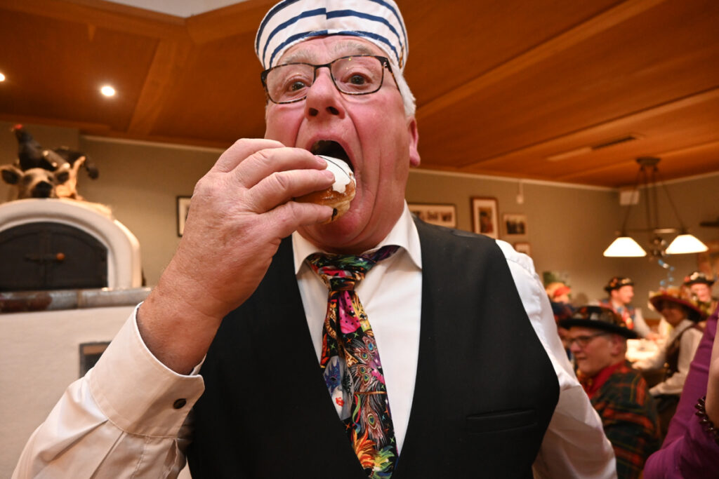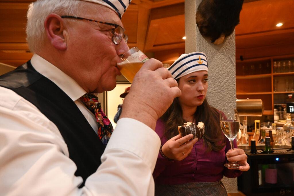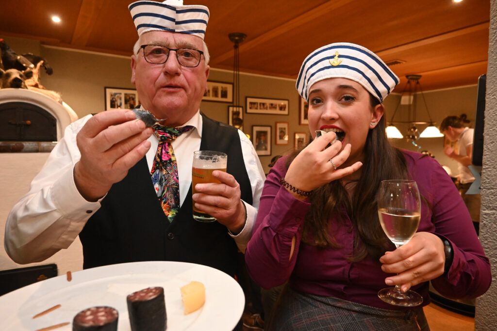 Und dann ist es soweit. Zwei Eleven werden neu ins Sammlervölkle aufgenommen. Gebe Fehr und Mona König müssen einige knifflige Fragen beantworten und dann zum Praxistest schreiten. Berliner, Harzer Roller, Bismarck-Hering und ein Zipfel Schwarzwurst warten auf die beiden. „Mir sottet“ drängt das Prüfungskomitee die Probanden, die die Leckerbissen dann noch mit einem Schluck Bier, einem Sekt und einem Schnäpsle runterspülen müssen.