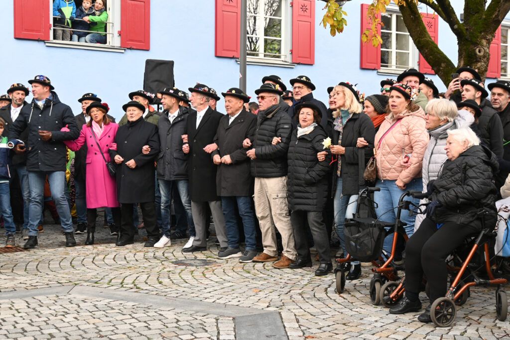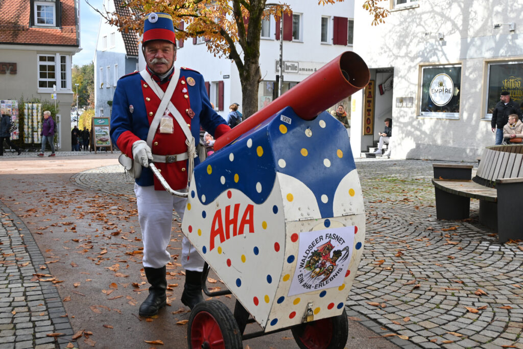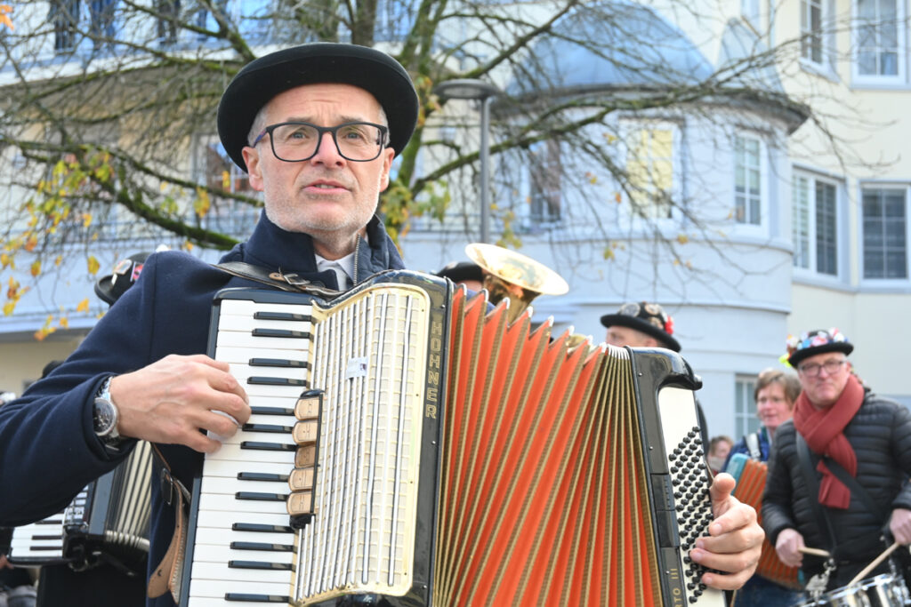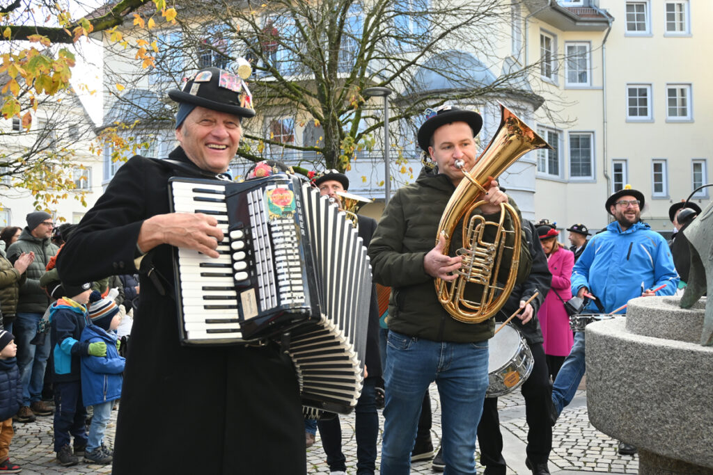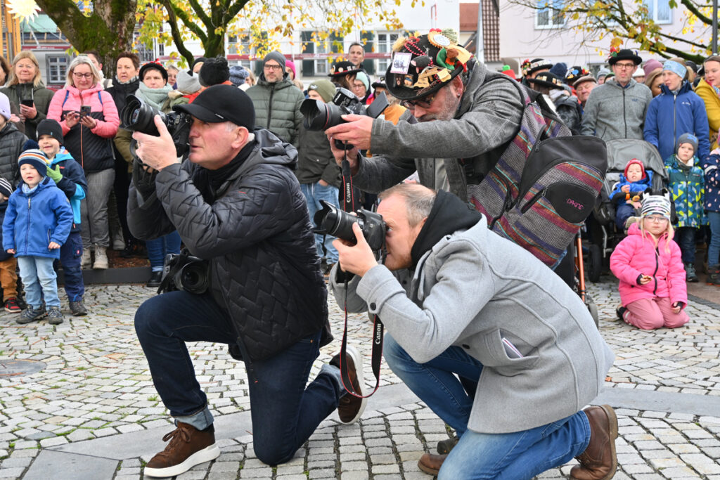 Pünktlich um 11.11 Uhr rasselte der überdimensionale Wecker, die Konfetti-Kanone gab ihre traditionellen drei Böllerschüsse ab. Die Sammlermusik marschierte auf die Hochstatt, gefolgt von der örtlichen Prominenz aus OB Matthias Henne, Bürgermeisterin Monika Ludy, dem Zunftrat samt den drei Ehrenzunftmeistern Gerold Glöckler, Franz Daiber und Franz Mosch.