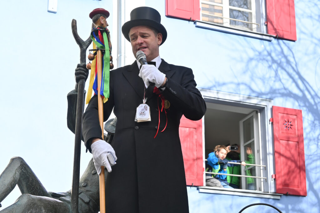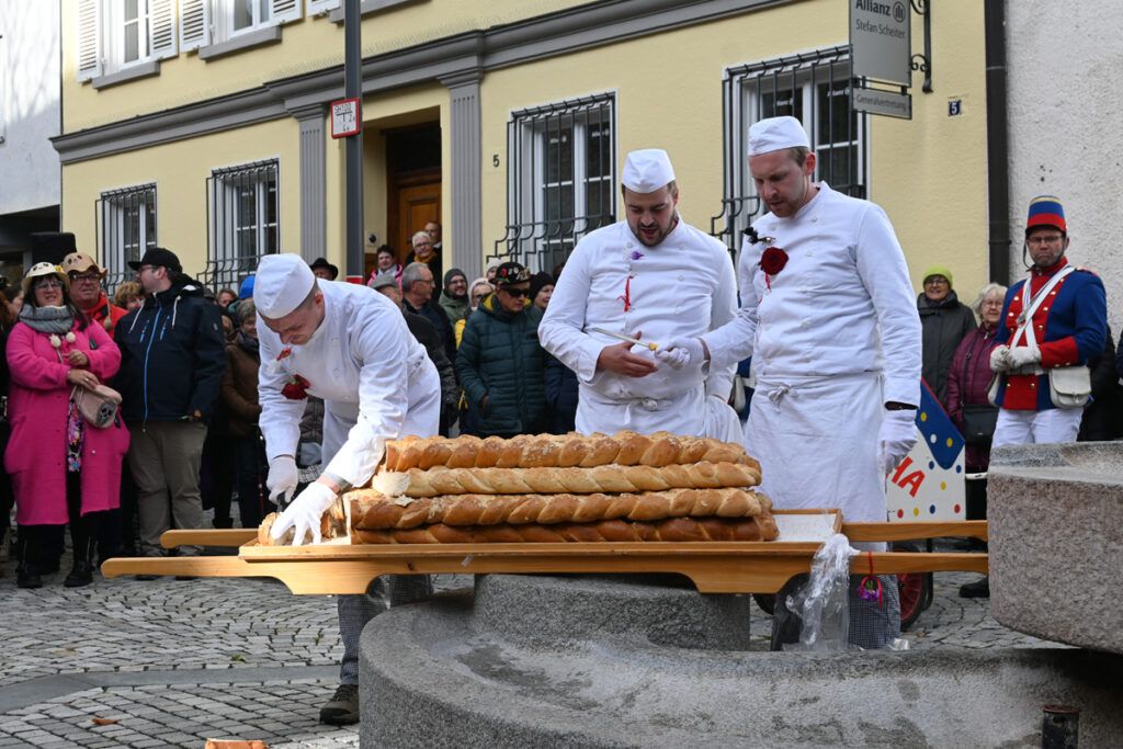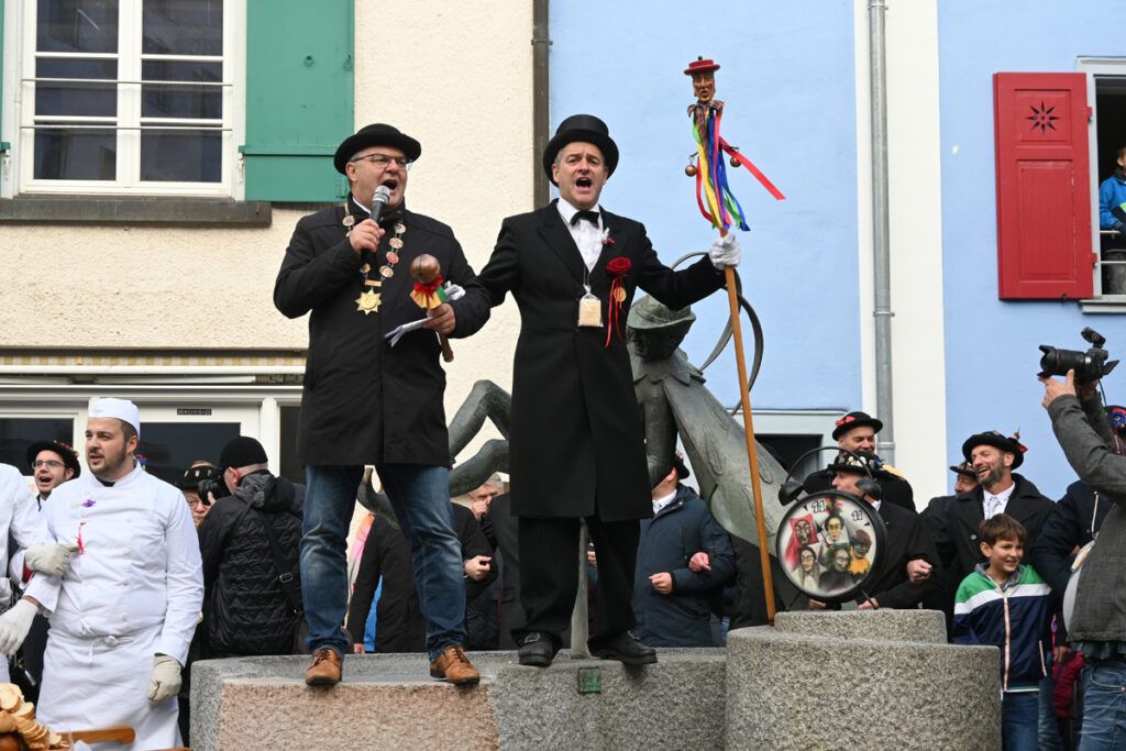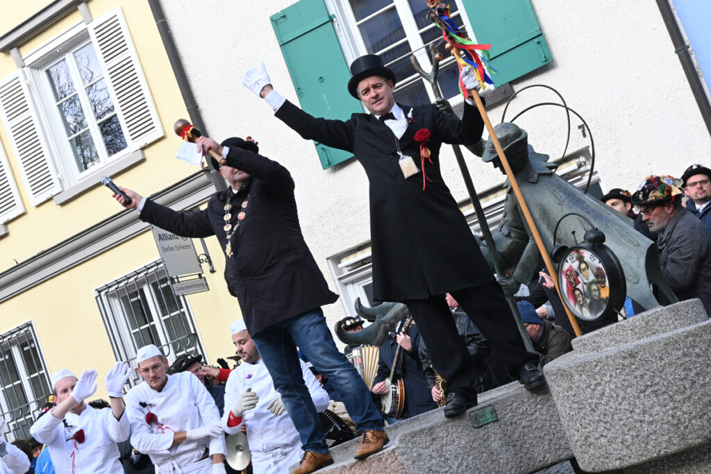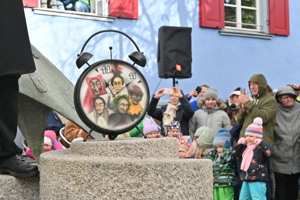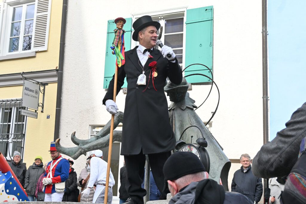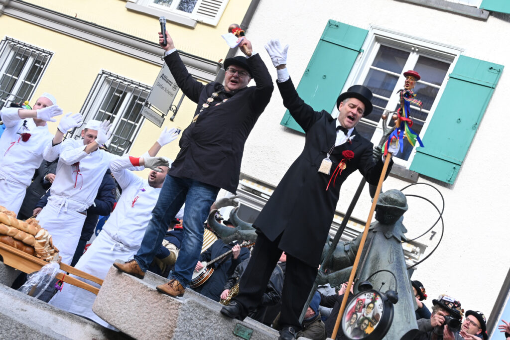 Um 11.00 Uhr trafen die ersten Protagonisten ein: Kanonier, Fasnetlader, Bäckergesellen, Hefezopf. Nach den Kindern enterte Hochzeitlader Ralph Zell den Brunnen. Mit launigen Sprüchen brachte er das Publikum auf fasnettaugliche Betriebstemperatur. Um die 500 bestens gelaunte Menschen hatten sich bei strahlendem Wetter, aber kühlen Temperaturen auf der Hochstatt versammelt.
