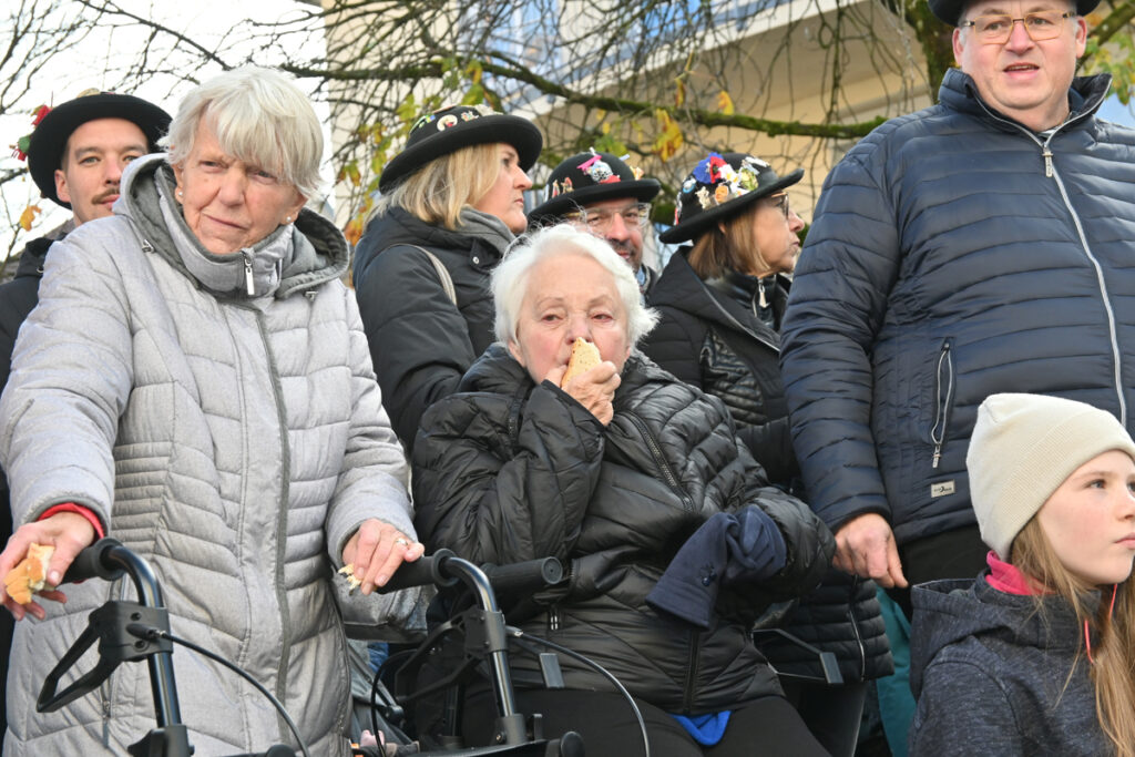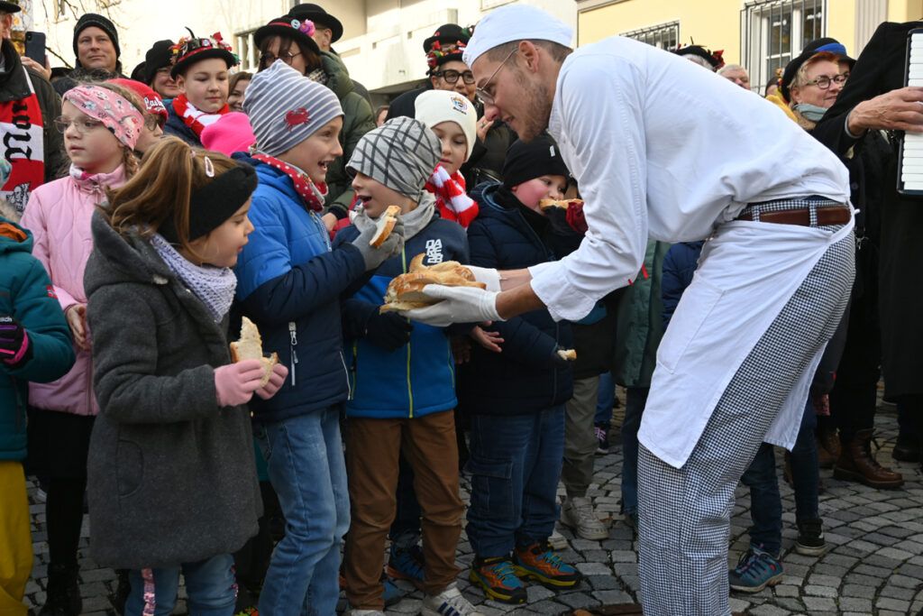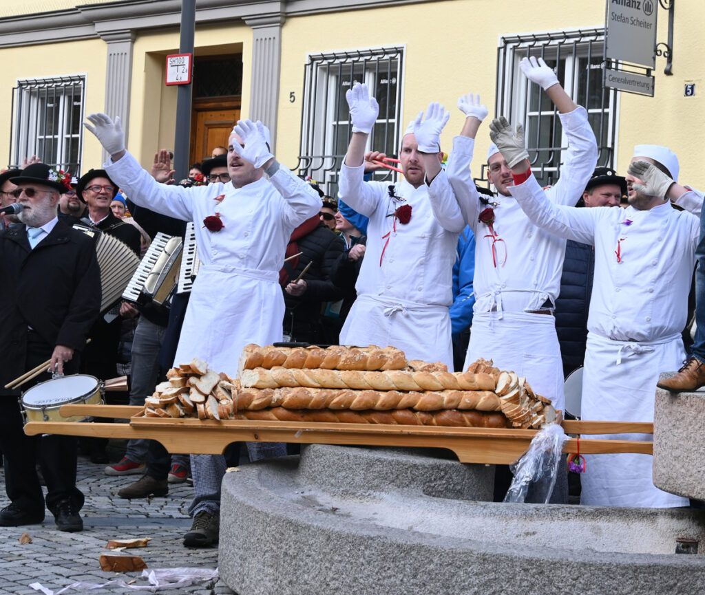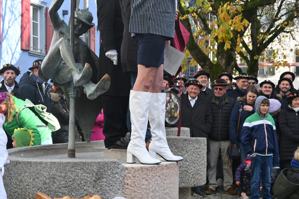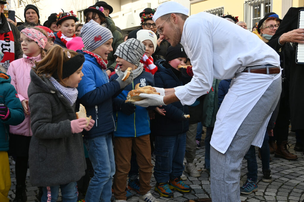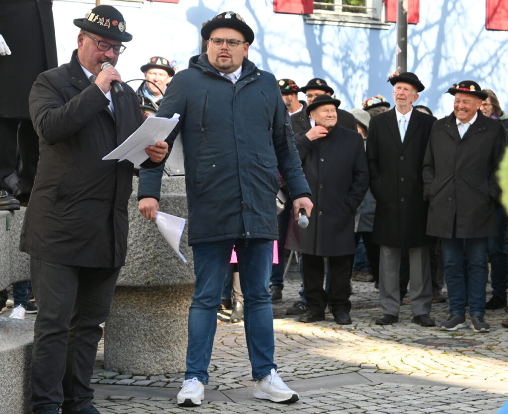 Um 11.00 Uhr trafen die ersten Protagonisten ein: Kanonier, Fasnetlader, Bäckergesellen, Hefezopf. Nach den Kindern enterte Hochzeitlader Ralph Zell den Brunnen. Mit launigen Sprüchen brachte er das Publikum auf fasnettaugliche Betriebstemperatur. Um die 500 bestens gelaunte Menschen hatten sich bei strahlendem Wetter, aber kühlen Temperaturen auf der Hochstatt versammelt.