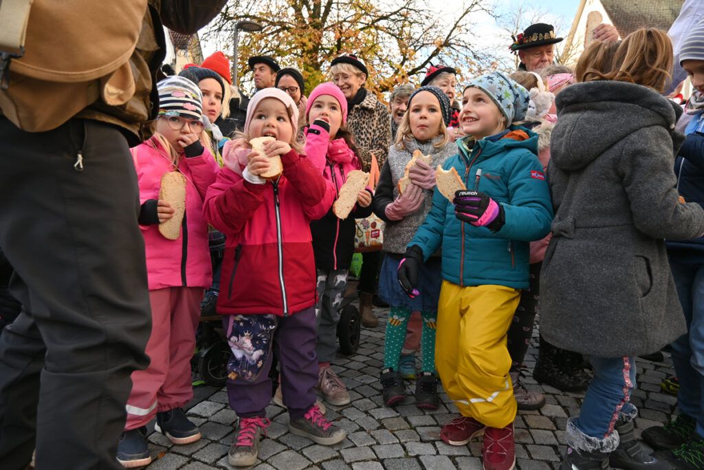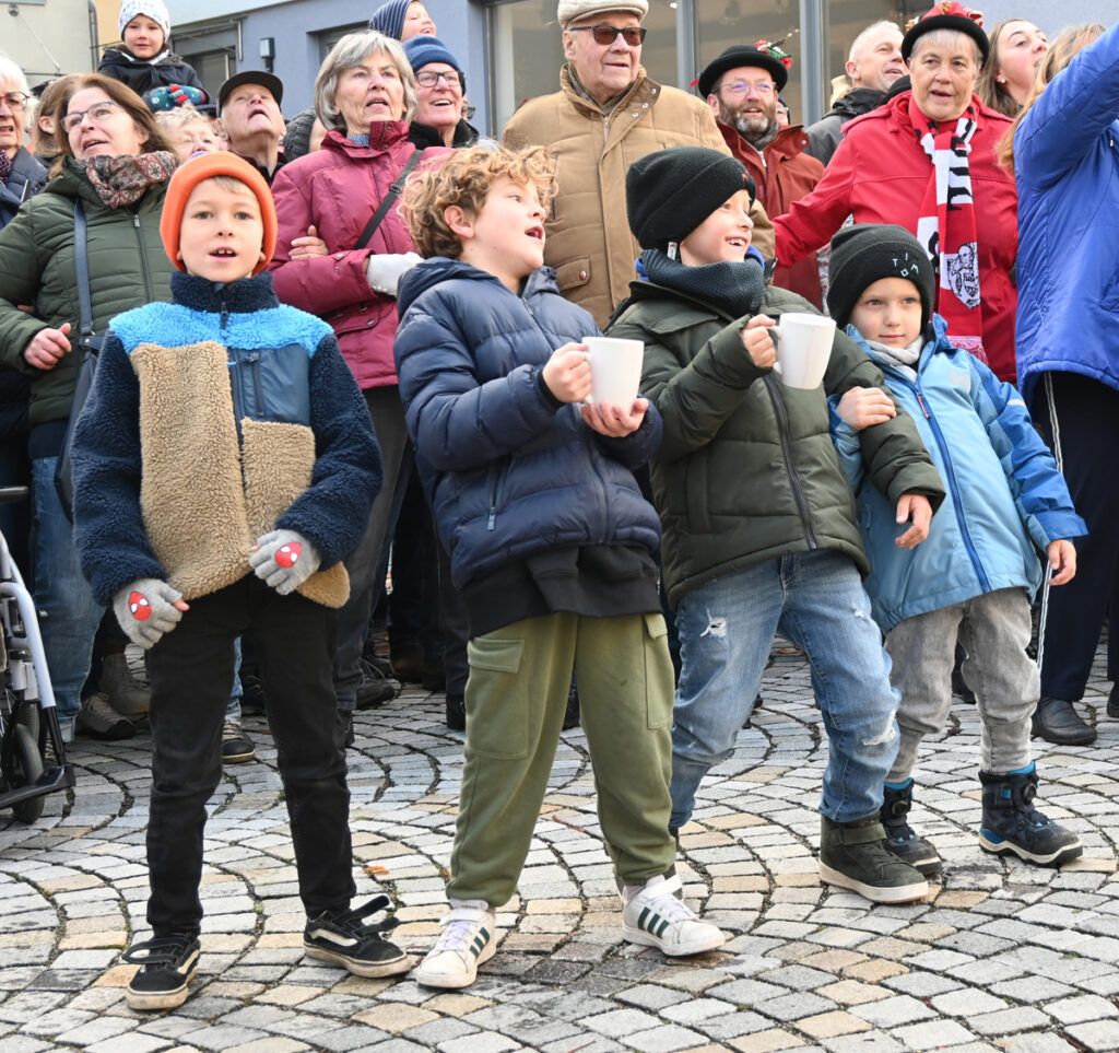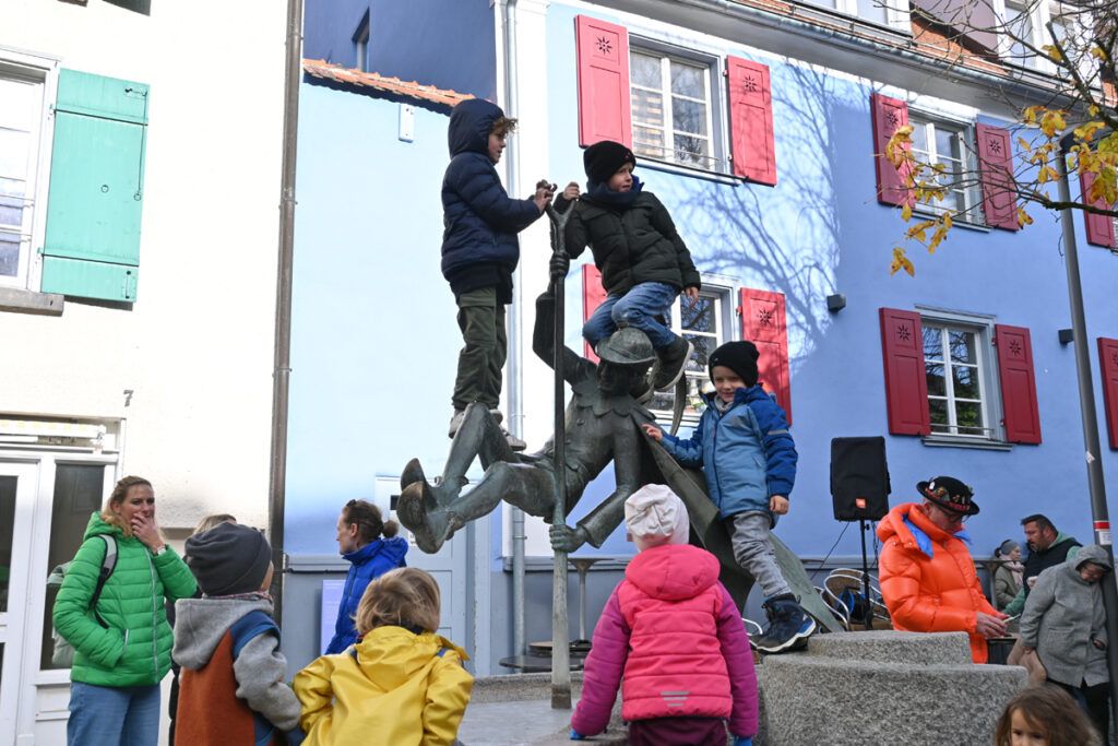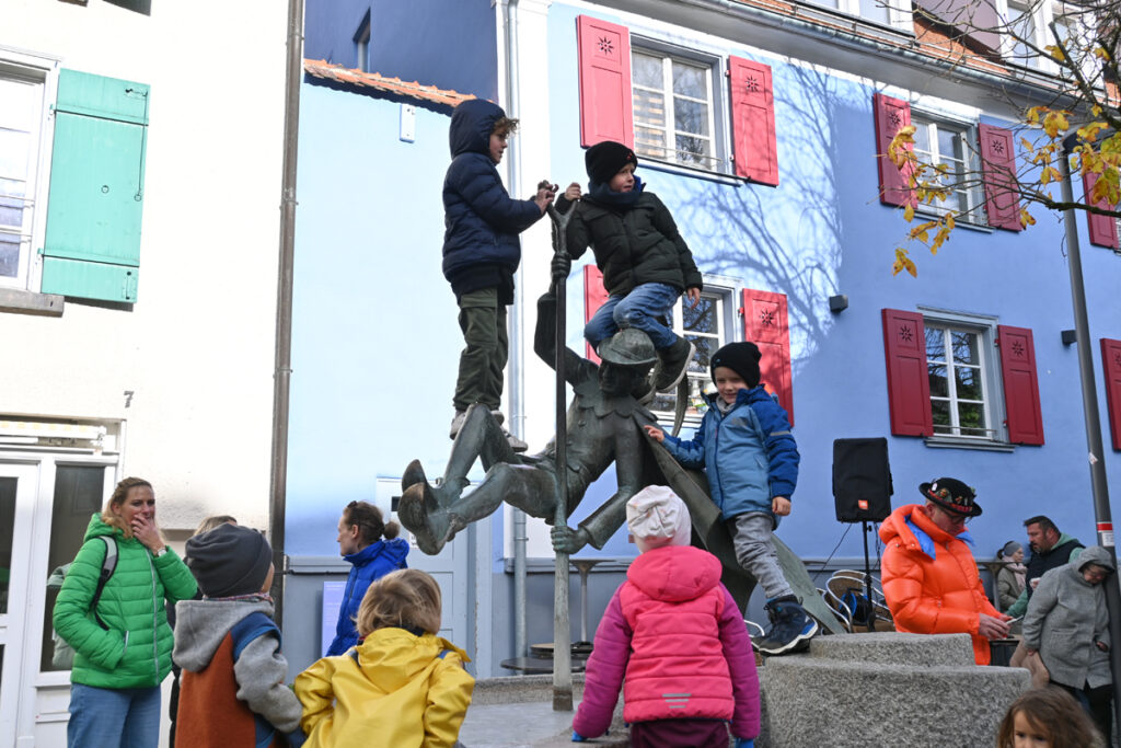 Als erstes hatten die Kinder den Federlesbrunnen auf der Hochstatt okkupiert und unterzogen ihn einem Härtetest: Wie viele Jungen und Mädchen kann das Federle tragen, bevor alle baden gehen? Am Elften Elften des Jahres 2023 blieb auf jeden Fall alles heil.