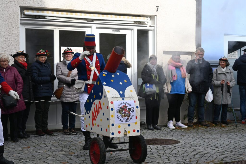 Zunftmeister Roland Haag schwang sich ebenfalls auf den Federlesbrunnen: S’isch soweit, liebe Narreleit“ und ließ die Sammlermusik erst mal einen Schunkler spielen. Der Fasnetslader spießte in gekonnter Manier viele Schwachstellen im Städtle auf: Von der Altstadt für Alle mit ihren ewigen Baustellen, so dass man aus dem Städtle bald nicht mehr ein noch aus findet. OB Hennes Imagefilm-Beitrag: „Der Waldseer ist ein herzensguter Mensch“ verleitet ihn zur Replik: „I glaub it, dass du jeden kennsch.“
