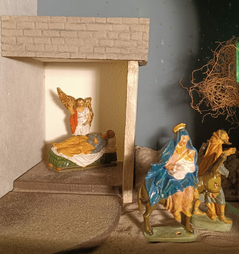 Der Engel erscheint Josef im Traum und warnt ihn vor der Gefahr durch Herodes. Daraufhin fliehen Josef und Maria mit den Kind nach Ägypten; Maria mit dem Kind reitet auf einem Esel.