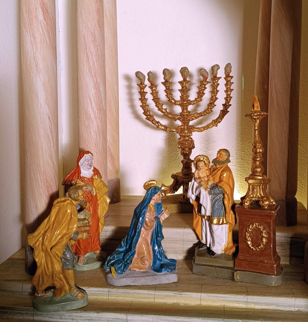 Maria und Josef begegnen im Tempel dem greisen Simeon, der das Kind preist als „Licht, das die Heiden erleuchtet“ (links hinten die ebenfalls im Tempel lebende hochbetagte Hanna).