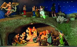 Meisterwerk der Krippenbaukunst mit Regionalbezug: die Zizenhausener Krippe des aus Kümmerazhofen stammenden Anton Sohn, eines Terrakotta-Künstlers des 19. Jahrhunderts. Hier die zentrale Krippenszene. Insgesamt werden in der Kapelle in Kümmerazhofen acht Szenen gezeigt.