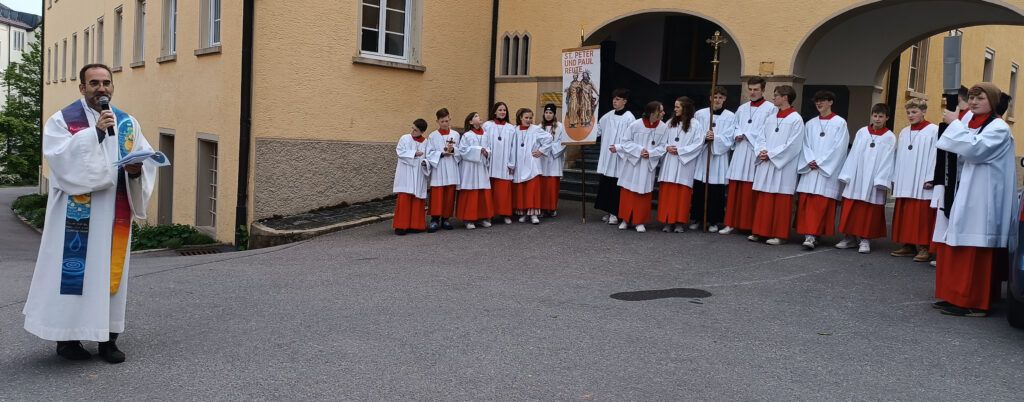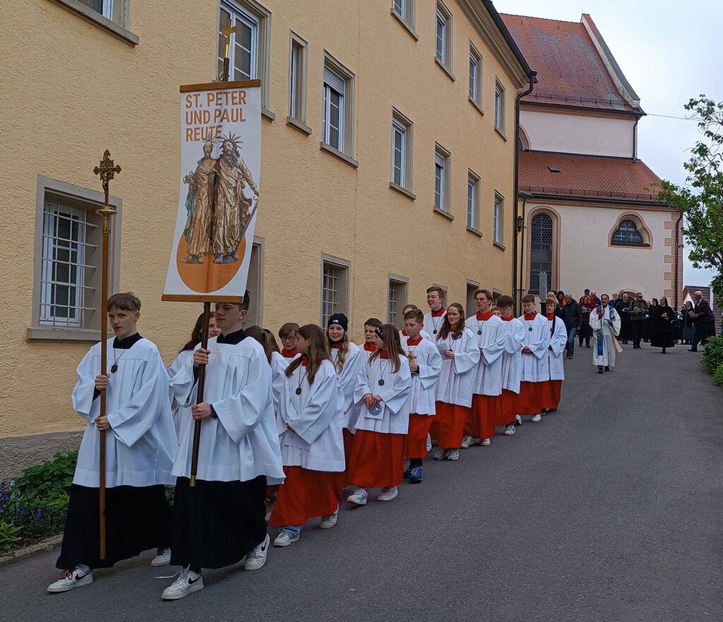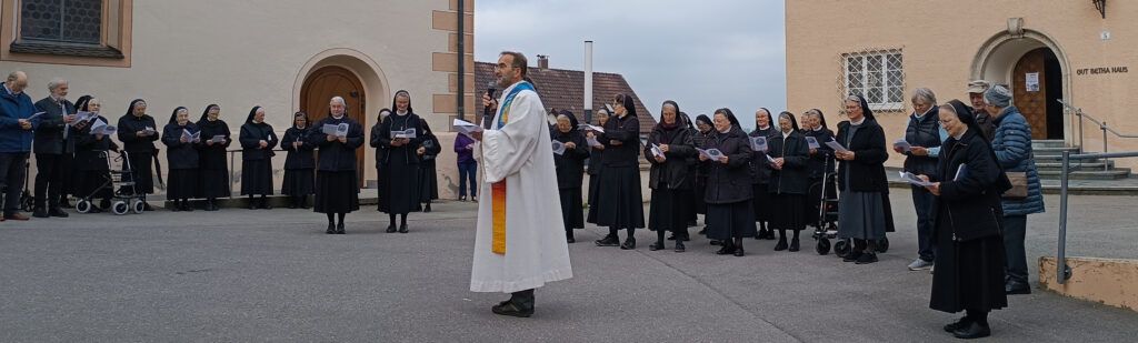 Es ist guter Brauch der Seelsorgeeinheit Bad Waldsee, einen gemeinsamen festlichen Gottesdienst an Christi Himmelfahrt auf dem großzügigen Gelände der Eugen-Bolz-Schule in Bad Waldsee zu feiern. In Reute trafen sich um 8.15 Uhr viele Gläubige auf dem Kirchplatz beim Kloster. Pfarrer Stefan Werner freute sich bei der Begrüßung, dass auch eine große Anzahl von Franziskanerinnen – an ihrer Spitze Generaloberin Schwester Maria Hanna sowie Pfarrer Ulrich Steck und der ehemalige Superior Martin Sayer – einen Teil des Weges mitgingen. Angeführt von einer stattlichen Ministrantengruppe ging es singend den Klosterberg hinunter zum Kreuz an der Wegegabelung. Nach einem Lied und einem flehentlichen Bittgebet um Frieden auf der Welt kehrten die meisten Schwestern wieder zum Klosterberg zurück.