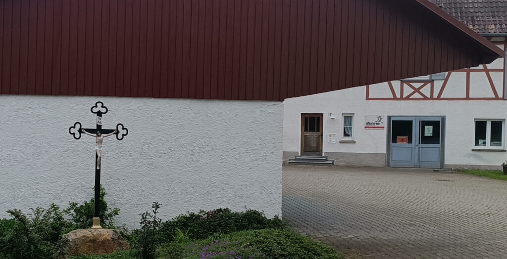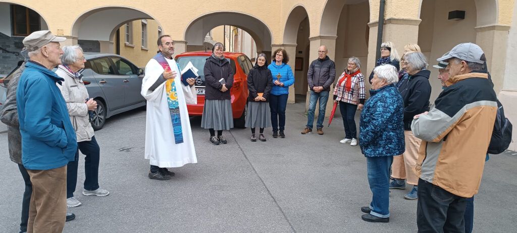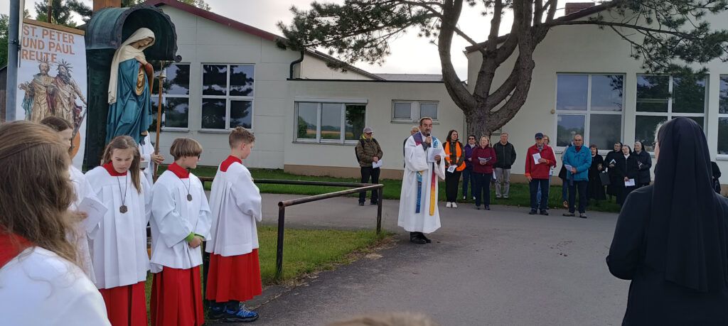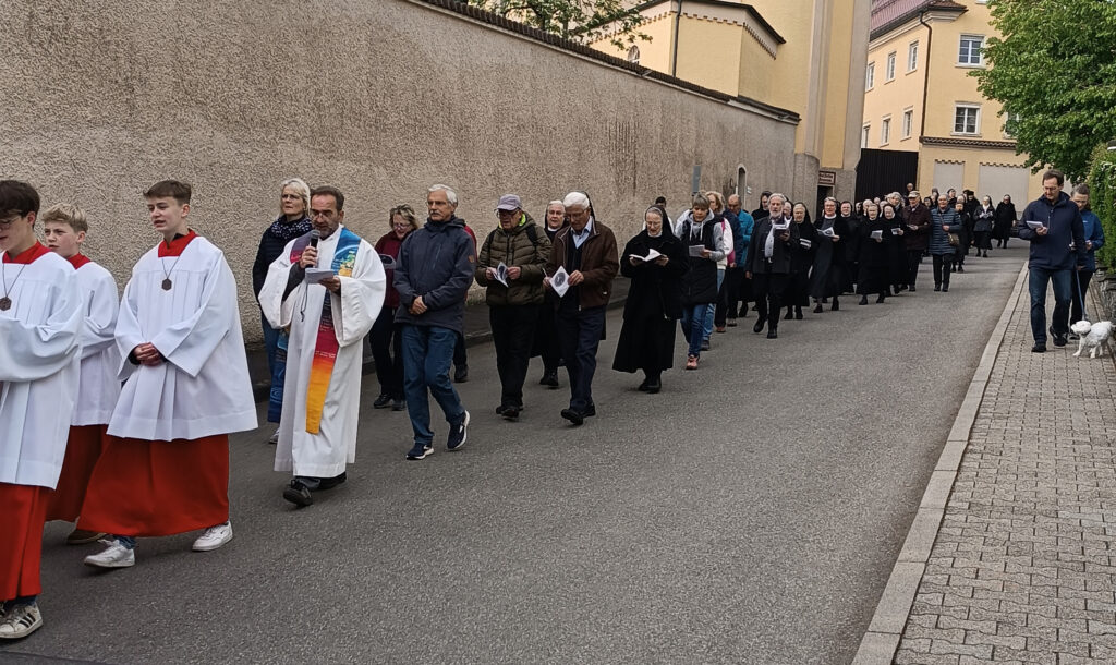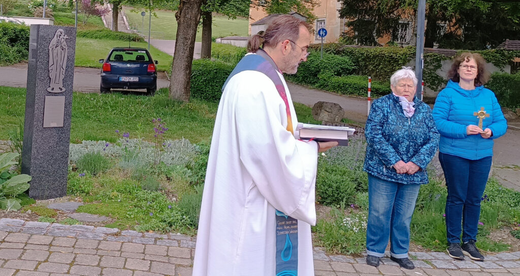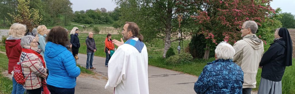 Am Mittwochabend (8.5.) trafen sich ebenfalls so viele Personen bei der Pfarr- und Wallfahrtskirche zum Bittgang nach Kümmerazhofen. Pfarrer Stefan Werner konnte hier auch Schwestern von Kloster Reute willkommen heißen. An der Gut-Betha-Stele auf dem Dorfplatz war dann erste Station. Nach einem Gruß an den heiligen Nepomuk an der Bachbrücke ging es zum Parkplatz des Gasthofs „Stern“. „Sei unser Gast“, diesen Leitspruch von der Landesgartenschau Wangen, benützte Stefan Werner zu einem besonderen Impuls.