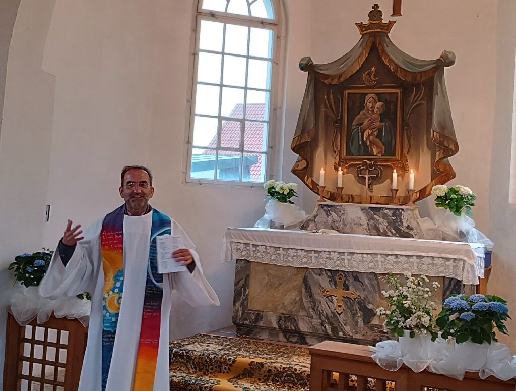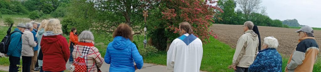 Nach dem Halt beim „Jehle-Kreuz“ ging es in Richtung Kümmerazhofen. Das Feldkreuz am Weiherweg empfing mit herrlich blühenden Bäumen die Wallfahrer. Beim Eintreffen in der Ortschaft begrüßte die Kirchenglocke die Beterinnen und Beter. Mit den bereits schon wartenden Gläubigen zusammen war die herrlich geschmückte Kapelle dann beim Gottesdienst bis auf den letzten Platz gefüllt. Eine besondere Liedauswahl begleitete hier Angela Brändle mit der Gitarre.