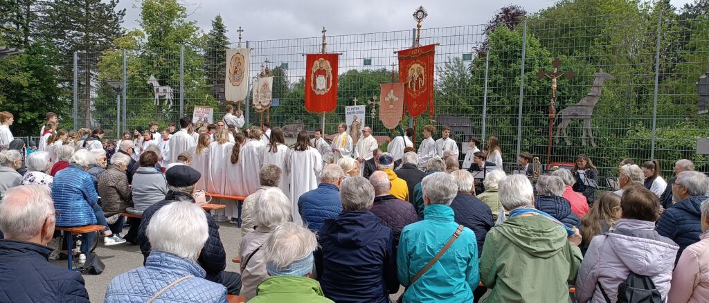Die Prozession führte weiter in Richtung Flugplatz zum Scheuerle-Hof. Hier wurden die Gläubigen mit herrlichem Vogel-Gezwitscher empfangen. Vorbei an blühenden Rapsfeldern zogen die Beterinnen und Beter in Richtung Steinach. Hier wurden die Wallfahrer von Wilhelm Noppenberger mit dem Glockengeläut der Steinacher Kapelle empfangen und begrüßt. Gute Technik machte hier eine Einspielung von Udo Lindenbergs Lied „Komm wir ziehn in den Frieden“ möglich. Gegen 10.30 Uhr war dann die Eugen-Bolz-Schule erreicht. Der große Freiplatz mit aufgestellten Bänken füllte sich hier schnell.