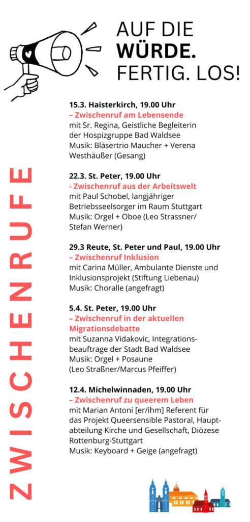Bad Waldsee / Haisterkirch – Die Seelsorgeeinheit Bad Waldsee gestaltet in der Fastenzeit sogenannte „Zwischenrufe“. In den vier Kirchengemeinden der SE wird es jede Woche am Samstag um 19.00 Uhr ca. eine dreiviertel Stunde um die Würde des Menschen in verschiedenen Lebenssituationen gehen und die Zeit wird durch Impulse, Gebete und Gesang gefüllt werden. Am Samstag, 15. März, findet der „Zwischenruf“ um 19.00 Uhr in der Pfarrkirche in Haisterkirch statt.