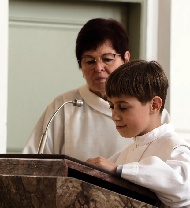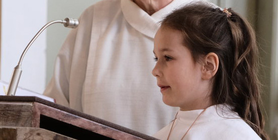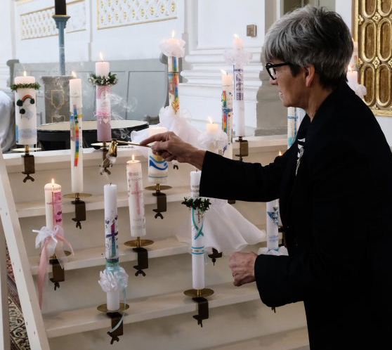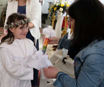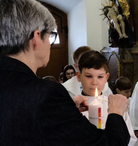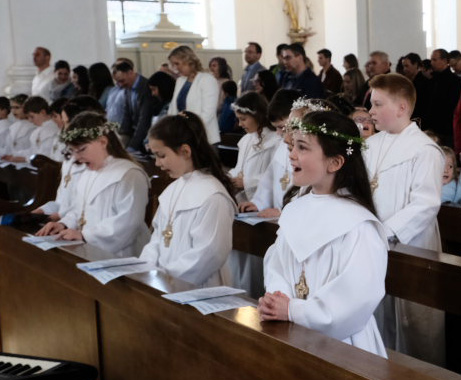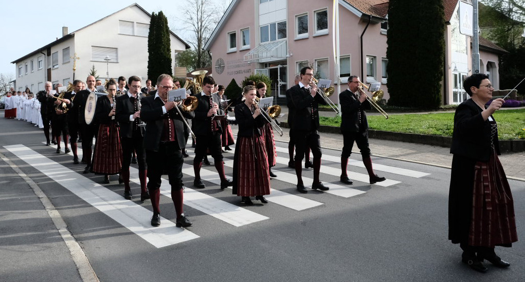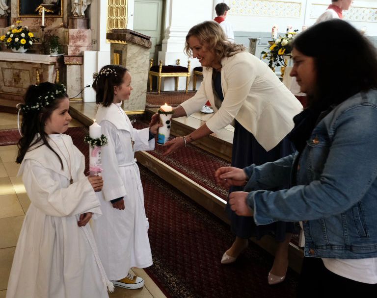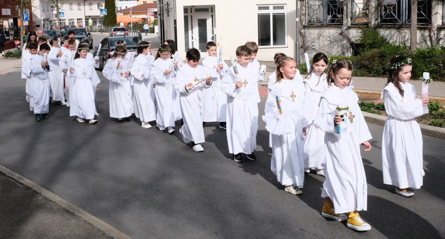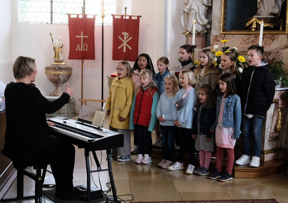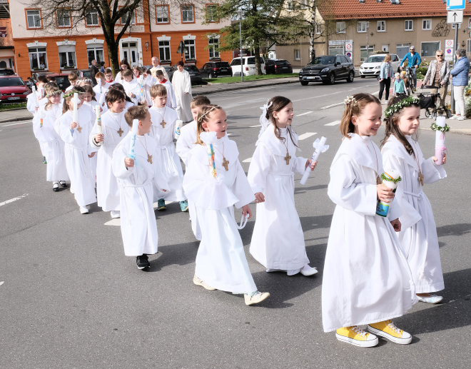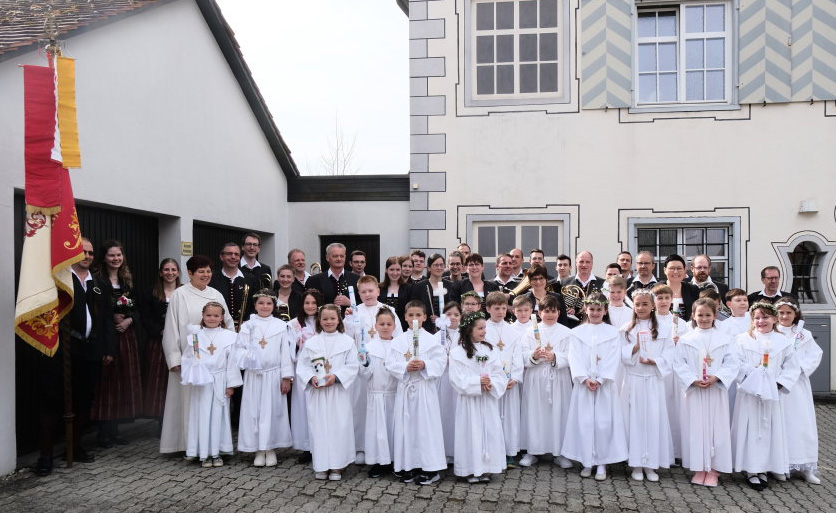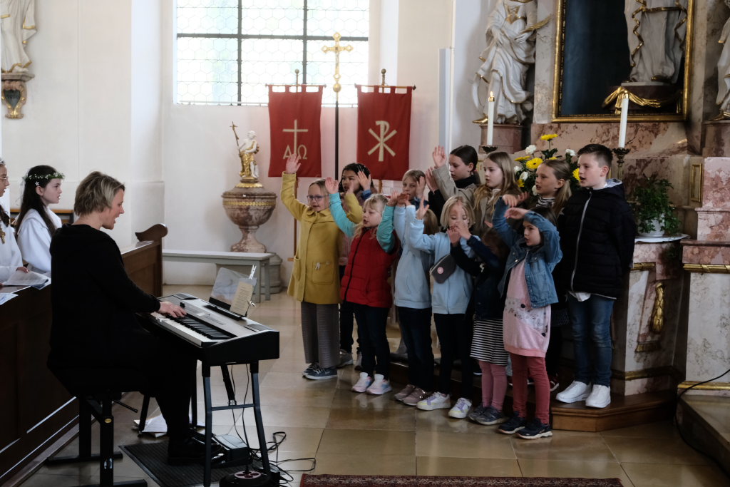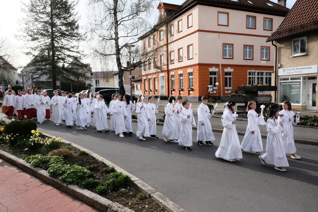 Nach der Einstimmung im Pius-Scheel-Haus mit Angelika Schupp geleitete die Stadtkapelle unter der Leitung von Petra Springer die Kommunionkinder vom Gemeindehaus zur Heiligen Messe in die St. Verena-Kirche. Nachdem dort im Eingangsbereich mit Feuer von der Osterkerze ihre Kerzen entzündet worden waren, hießen einige der Kinder Eltern, Geschwister und Verwandte zu diesem großen Festtag willkommen. Weiter trugen sie mit dem Verlesen der Fürbitten und der gemeinsam mit dem Kinderchor unter der Leitung von Bernadette Vogt gesungenen Kommunionhymne „Du gehst mit!“ zum feierlichen Charakter des Gottesdienstes bei.