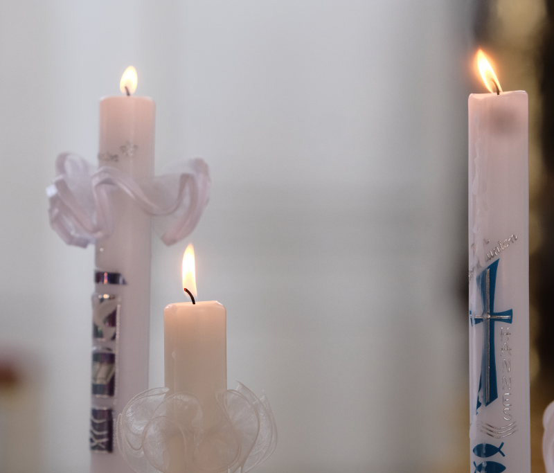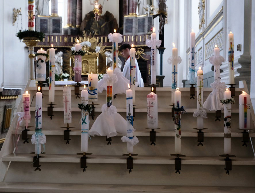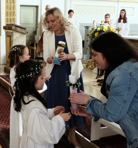Zur Gabenbereitung versammelten sich die Kinder mit Pfarrer und Gemeindereferentin im Kreis um den Altar, wo sie nach dem Sanctus, Friedensgruß und Agnus Dei gemeinsam zum ersten Mal die Hostie empfingen und damit zu Mitgliedern der Kirchengemeinde wurden.