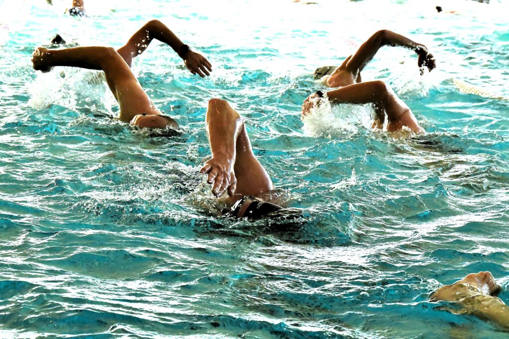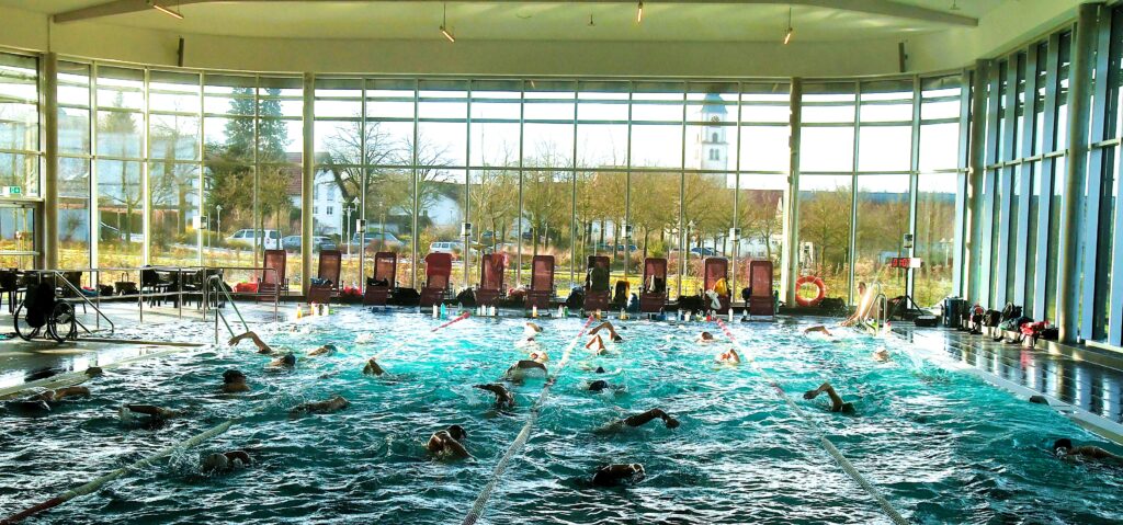 Morgens um 9.00 Uhr wurde das Hallenbad von Bademeister Falko Hey für die versammelten Schwimmer geöffnet. Die Stadt Bad Wurzach unterstützt die Aktion und stellte das Hallenbad kostenfrei zur Verfügung. Die 40 Schwimmer verteilten sich auf die vier eingezogenen Bahnen und Schwimmtrainer Raimund Maurus appellierte noch an alle, auf Schwimmdisziplin und sportliche Fairness zu achten. „Mehr als 10 Teilnehmer pro Bahn geht einfach nicht“ ist das Fazit des langjährigen Trainers der Triathleten „und selbst dann müssen die Schwimmer noch gut harmonieren“. Um 9.30 Uhr gab Bene Schad mit seiner großen Digitalanzeige den Startschuss und das Wasser im Hallenbad begann zu brodeln und zu kochen. 80 Kraulschwimmerarme verwandelten das Hallenbad in eine pulsierende Waschmaschine. Zwei Stunden Schwimmen ist lang und das Geheimnis des Erfolgs ist ein gleichmäßiges zügiges Tempo. Nur kurze Pausen wurden auf den einzelnen Bahnen eingelegt, um zwischendurch etwas zu trinken oder ein Bananenstück zu essen.