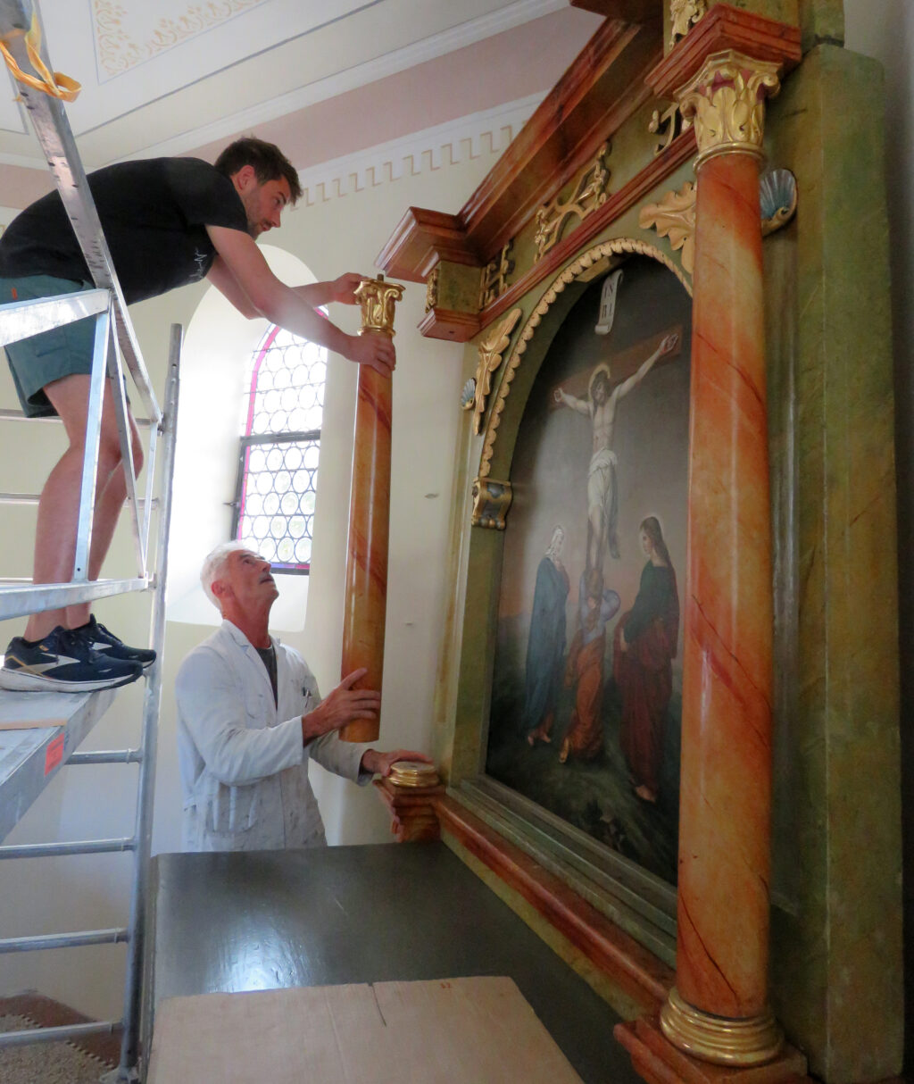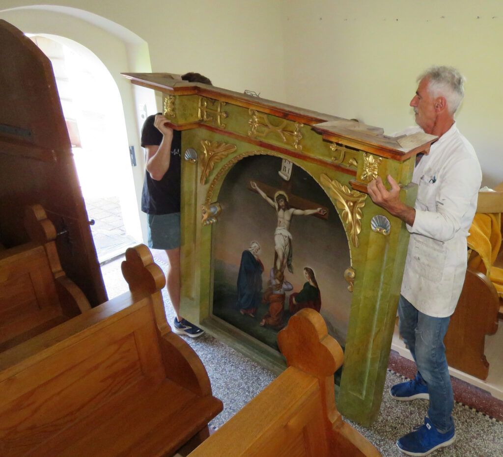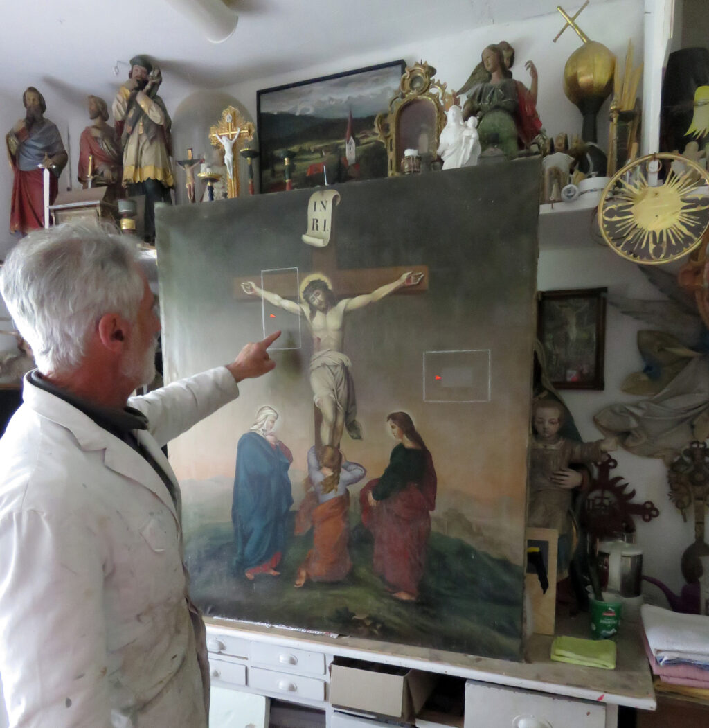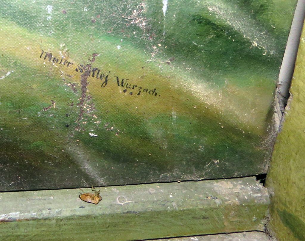 Schäden am Altarbild der Brugger Kapelle vor der Restaurierung. Das Bild ist mit „Maler Schley Wurzach“ signiert. Es stammt von 1866.