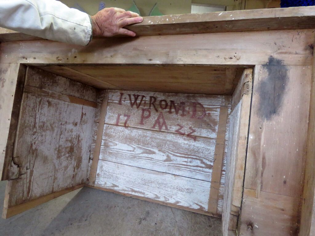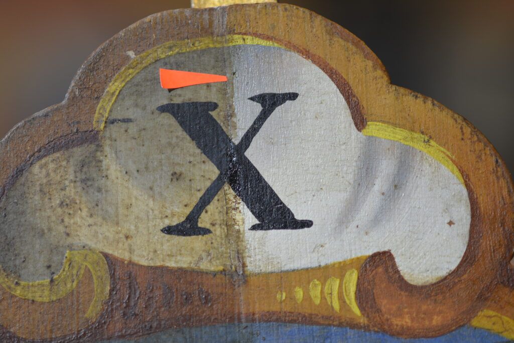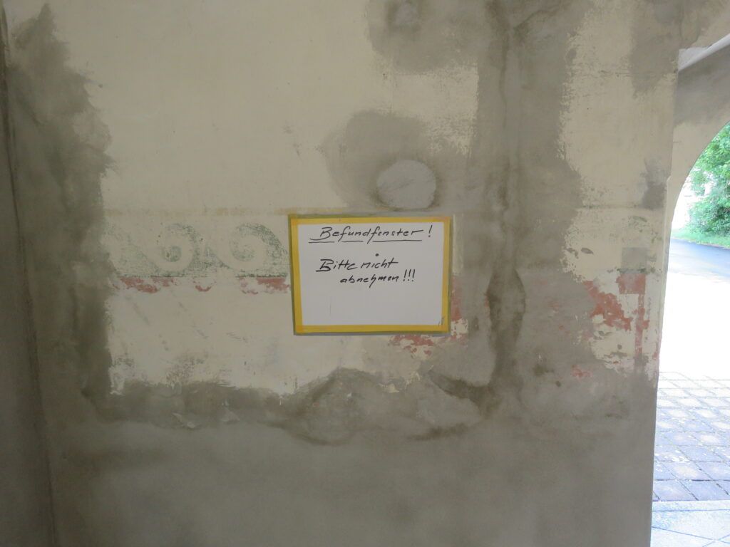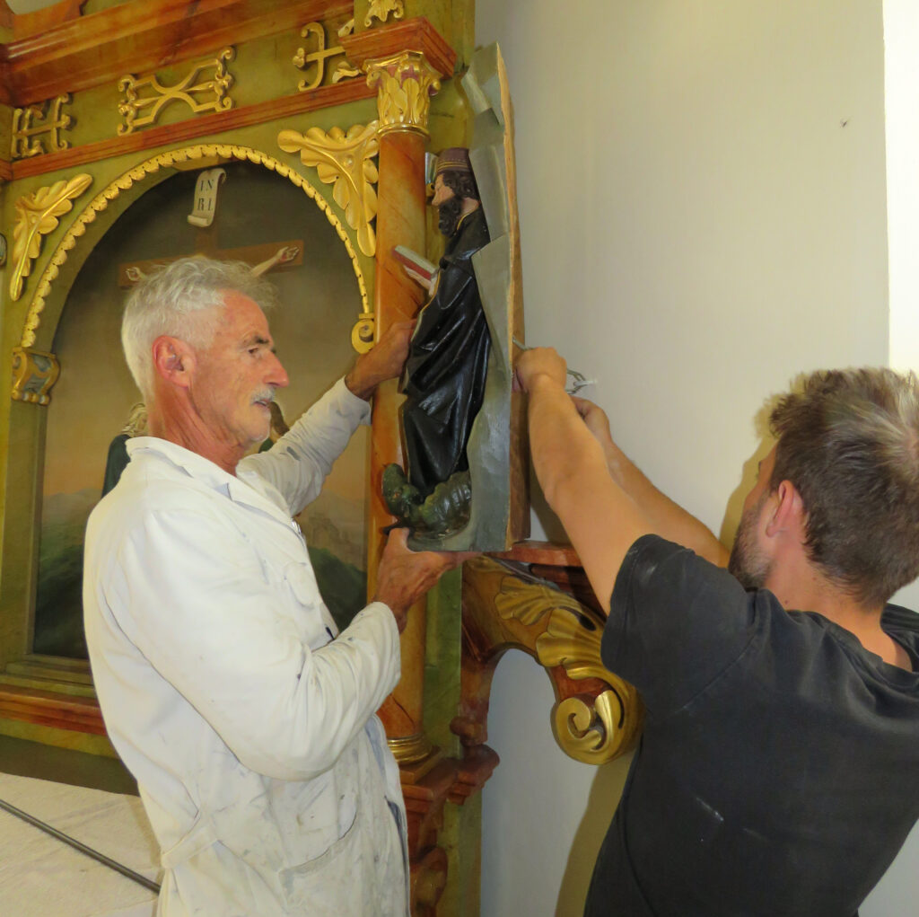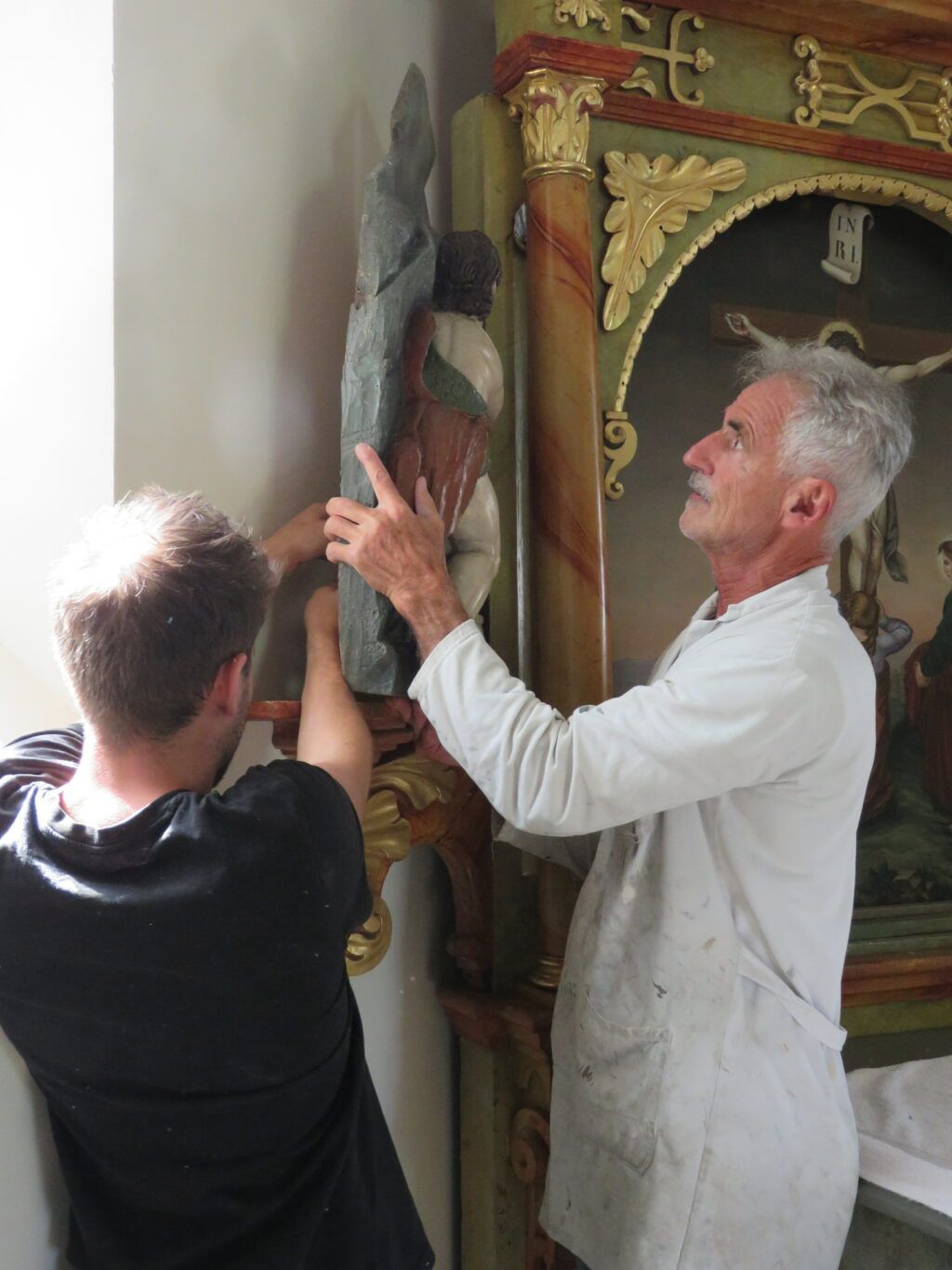 Schäden am Altarbild der Brugger Kapelle vor der Restaurierung. Das Bild ist mit „Maler Schley Wurzach“ signiert. Es stammt von 1866.