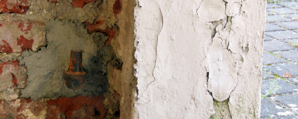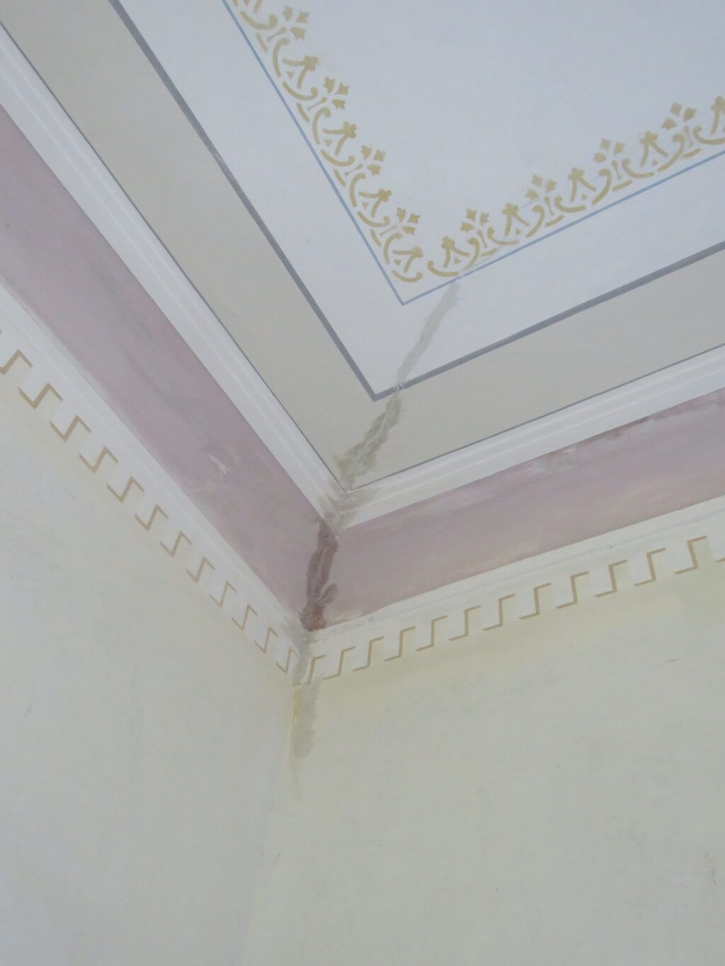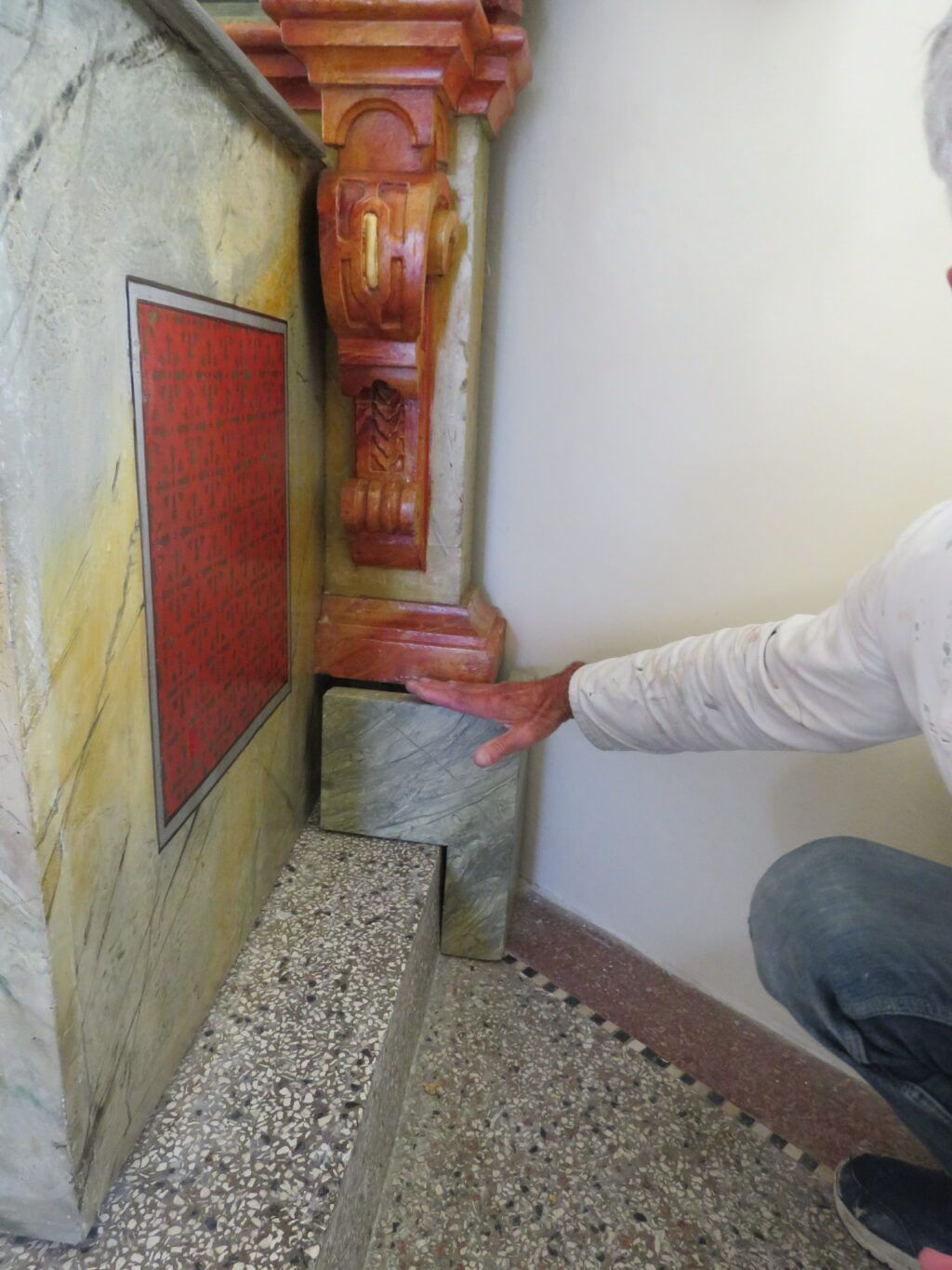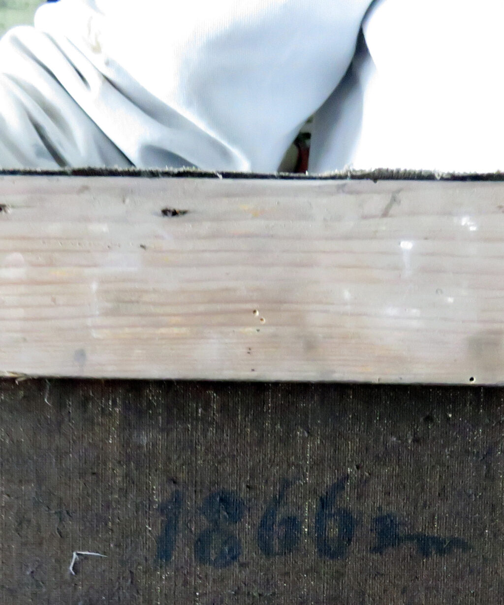 Schäden am Altarbild der Brugger Kapelle vor der Restaurierung. Das Bild ist mit „Maler Schley Wurzach“ signiert. Es stammt von 1866.