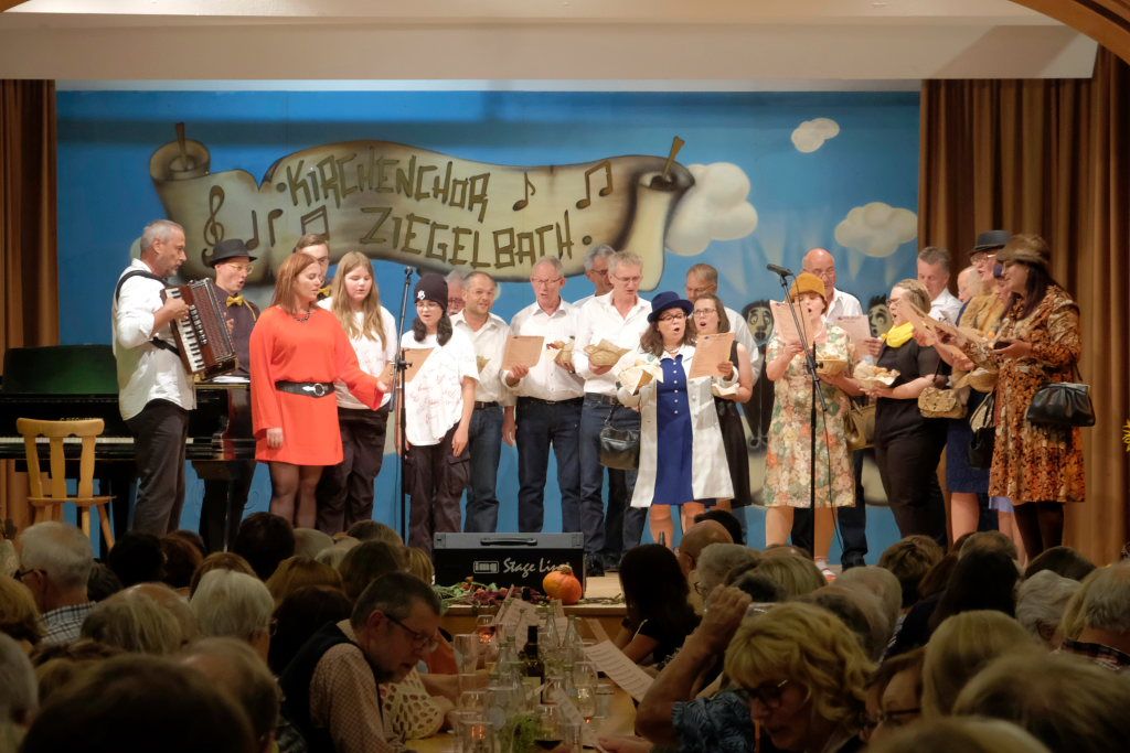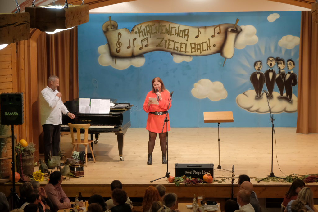 Als Tine Wespel, Vorstand des Kirchenchores Ziegelbach, gemeinsam mit dem musikalischen Leiter Günter Musch um kurz nach acht die Bühne betraten, um das Publikum zu begrüßen und den Auftrittsmodus zu erklären, lagen bereits aufregende Stunden hinter ihnen: weil ihr Hauptakteur plötzlich erkrankt war musste die Gruppe ChaRRmant auf die Reise nach Ziegelbach verzichten, so dass an diesem Abend schließlich nur vier Gruppen auf der Bühne des Dorfstadels standen.