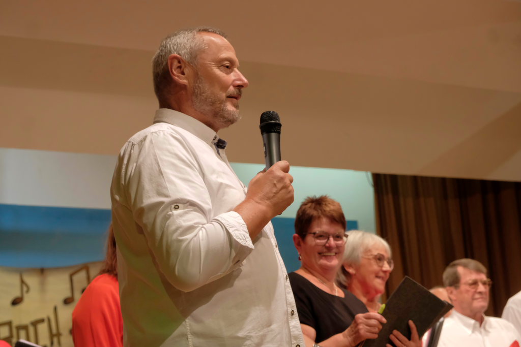 Für richtig „Stimmung“ sorgte Güner Musch mit seinem Witz zu Beginn des zweiten Konzertteiles mit dem Frauenchor des Ziegelbacher Kirchenchores: Dass Frauen für den einfachen Vorgang des Geldabhebens am Automaten fünfmal so viele Aktionen benötigen wie ein Mann brachte den weiblichen Teil des Publikums etwas in Wallung
