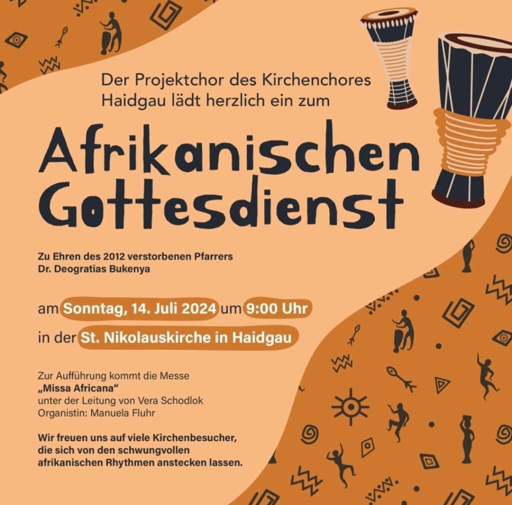 Haidgau – Der Projektchor des Kirchenchors Haidgau lädt herzlich zum afrikanischen Gottesdienst zu Ehren des 2012 verstorbenen Pfarrers Dr. Deogratias Bukenya ein. Am Sonntag, 14. Juli, um 9.00 Uhr in der St. Nikolauskirche in Haidgau kommt die Messe „Missa Africana“ unter der Leitung von Vera Schodlok zur Aufführung.