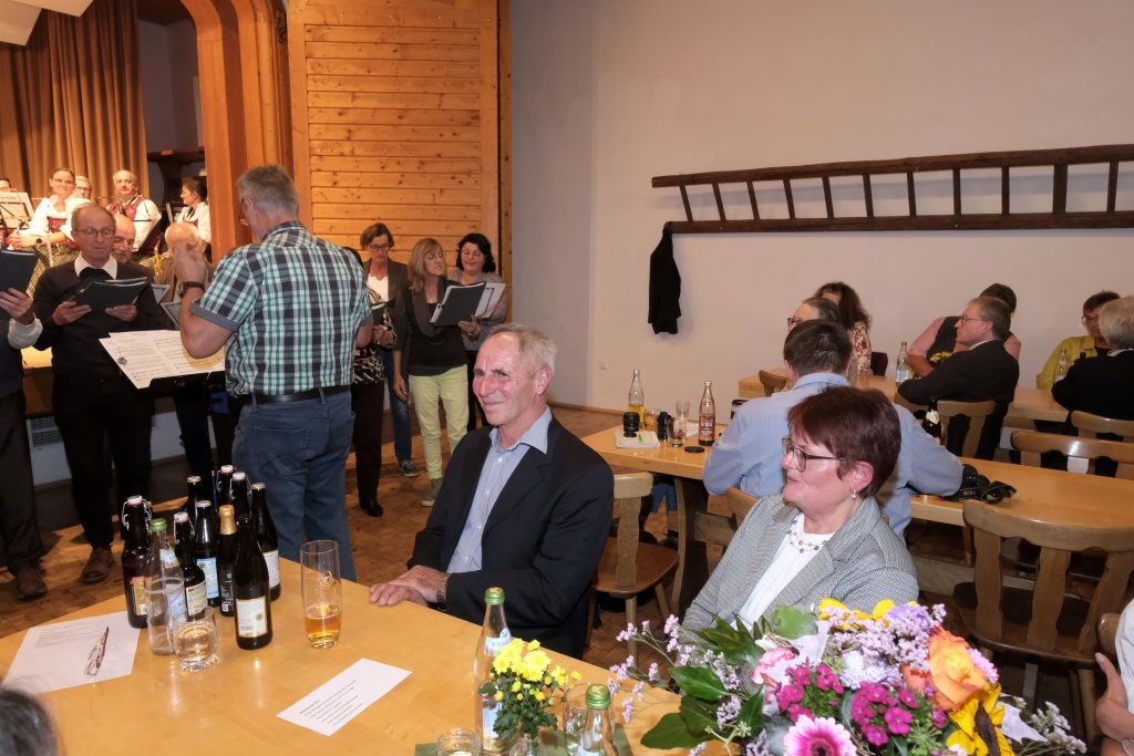 Nach zwei Liedern des Kirchenchors durfte Berthold Leupolz, der altersmäßig zwar jüngste, aber dennoch der dienstälteste aller Wurzacher Ortsvorsteher – er ist wie Reichle ebenfalls seit 25 Jahren im Amt – die Lobrede im Namen der Kollegen halten. In seiner Amtszeit habe Reichle drei Bürgermeister und viele Ortsvorsteher Kollegen kommen und gehen sehen. „25 Jahre hast Du neben der Familie deiner Ortschaft gewidmet. Wir haben viel bewegen können. Es war ein schönes Miteinander und es war – auch im Namen der Kollegen – schön, mit Dir zu arbeiten.“ Alfons Reichle sei nie ein Streithammel gewesen und habe immer ein offenes Ohr für jeden gehabt. Dafür sprach er ihm ein ehrliches „Vergelt´s Gott“ aus. Als Geschenk gab es für Reichle und seine Frau einen Gutschein für ein Essen im „Torfstecher“; bis dahin wurde er schon einmal von den Kollegen mit allen Biersorten aus der Region versorgt, mit der Auflage, am Ende den Kollegen „das Beste“ zu vermelden.