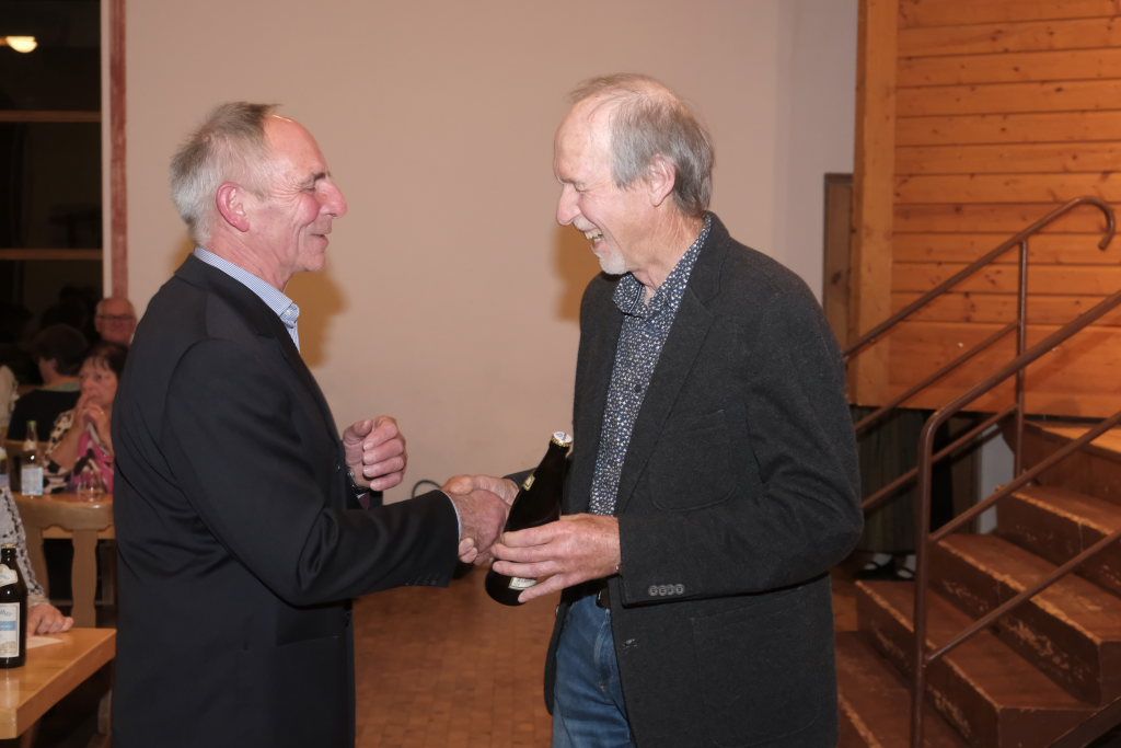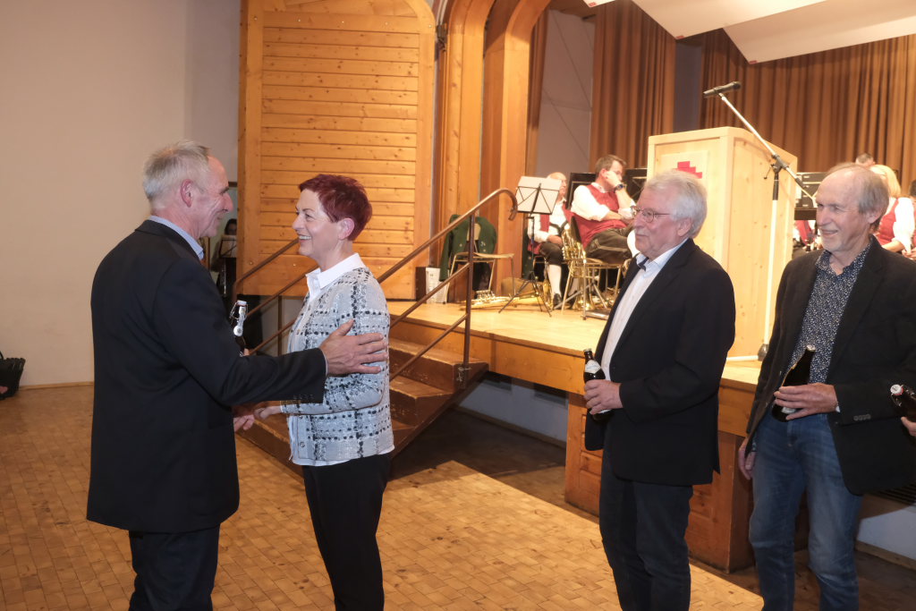 Der 69-jährige Alfons Reichle selbst sagte in seiner Dankesrede: „Man wusste ja nicht, was auf einen zukam, aber die Ortschaft war gut aufgestellt. Mein Vorgänger Alfred Wirth half mit guten Tipps und ich hatte viele Helfer.“ Er habe sich auf das stets gute Verhältnis mit zu Ortschaftsräten stützen können. Das ließ sie auch gemeinsam kitzlige Situationen wie das OGI-Fiasko überstehen. Reichle dankte der Bürgermeisterin und ihren beiden Vorgängern, die jederzeit erreichbar waren. Ein besonderer Dank ging an den Bauhof und an den Gemeinderat. „Unsere Vereine sind mir sehr ans Herz gewachsen.“ Besonders nannte er die Feuerwehr, die Tag und Nacht einsatzbereit sei und nun ihr neues Fahrzeug bekommen hat. Und den Kirchenchor und die Musikkapelle für die vielen schönen gemeinsamen Stunden. Ein besonderer Dank ging auch an die Kirche, vertreten durch Pfarrer Patrick Meschenmoser. Durch Grundstückabtretungen seitens der Kirche seien Projekte wie der Radweg und die barrierefreie Bushaltestelle erst möglich geworden. Ein ganz besonderer Dank ging an den ehemaligen Hausmeister Charlie Glaser, der ehrenamtlich die Wände des Dorfstadels gestrichen hatte, so dass er nun in neuem Glanz erstrahlen konnte. Alfons Reichle vergaß auch nicht, seiner „rechten Hand“ Doris Grimm zu danken, die in allen Vereinen der Ortschaft sehr verwurzelt ist. Zu guter Letzt zeigte er sich auch seiner Familie zu großem Dank verpflichtet, die auf dem Hof dafür sorgte, dass alles weiterlief, wenn er auswärtige Verpflichtungen hatte.