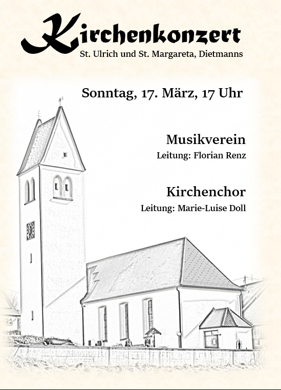 Dietmanns – Kirchenchor und Musikverein Dietmanns gestalten am Sonntag, 17. März, um 17.00 Uhr in der Kirche St. Ulrich und St. Margareta ein Gemeinschaftskonzert.